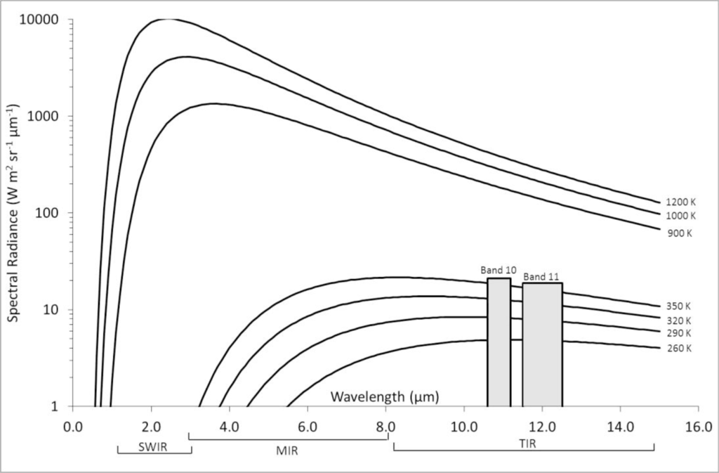 The spectral range of sensitivity within which the TIRS bands (Landsat-8 bands 10 and 11) operate, overlain on the Planck Function displaying the temperature range these bands are capable of detecting and, for comparison, the infrared emissions from surfaces at a range of temperatures.