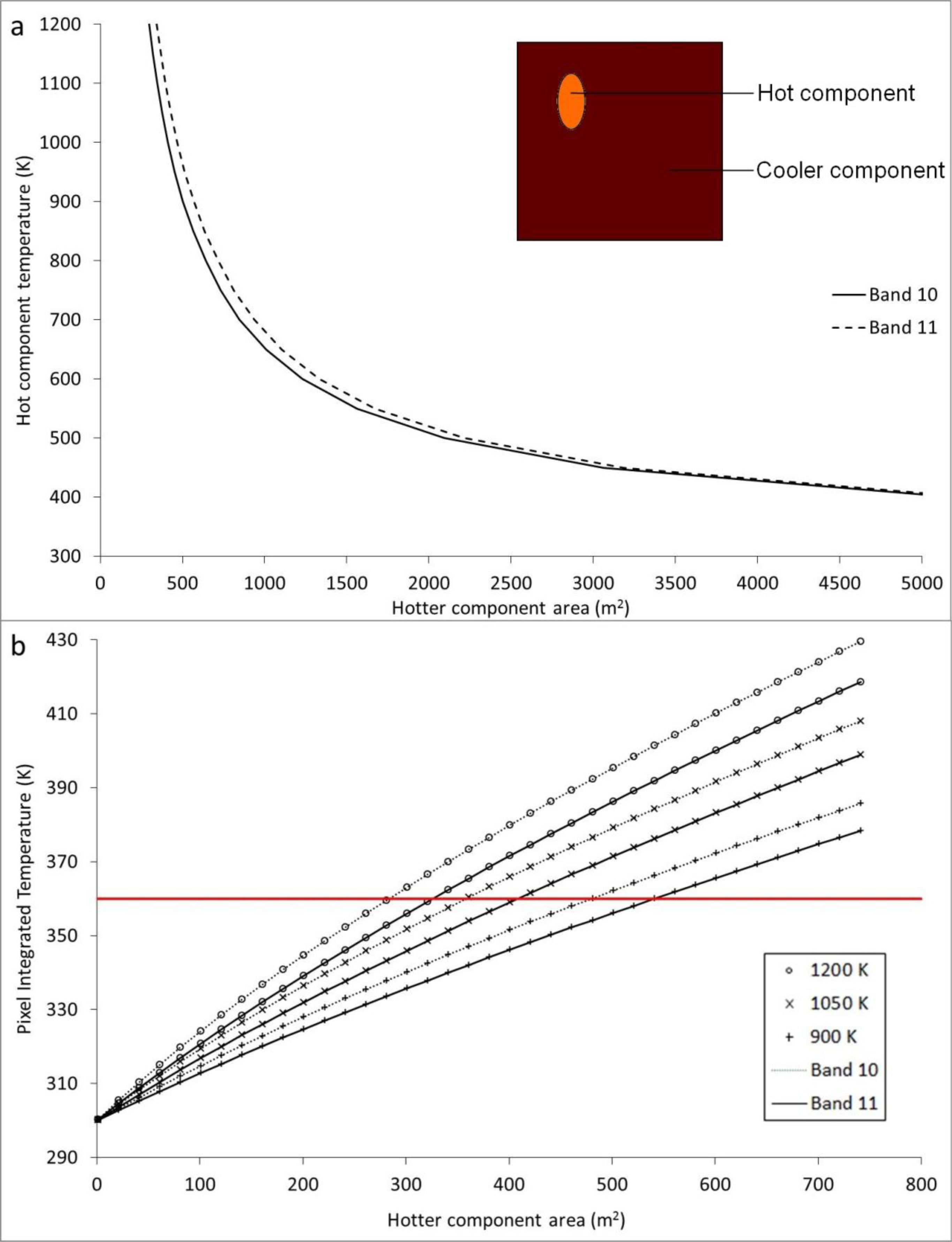 (a) Simulated volcanic-like surfaces being viewed within one TIRS pixel, with two sub-pixel components of varying size and temperature which would produce a TIRS pixel integrated temperature at the peak of detection for 10,000 m2 TIRS pixels: 360 K [1]; this assumes a cooler component temperature of 300 K. Inset: a representation of the theoretical heterogeneous pixel assumed in these scenarios, with a small hot component representing high temperature elements such as fresh lava or cracks in the carapace of a lava dome, and a larger cooler component (here at 300 K) representing the non-volcanic background surface. (b) The range of pixel integrated temperatures (PITs) that individual TIRS pixel detection components would detect as emitted from a surface with a cooler component (or background) temperature of 300 K and a hotter component with the characteristics displayed. The red line represents the limit of detection for TIRS.