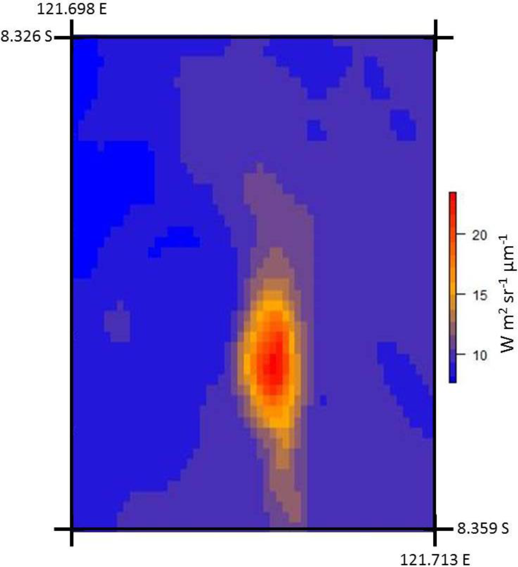 Top of atmosphere values provide an indication of the temperatures at the surface but, being at an altitude of 708 km in the case of Landsat-8, to accurately determine the emissions of energy actually leaving the surface and hence, the true PIT at the surface, the radiant signal must be corrected for the influence of the atmosphere that it has passed through; the emissivity of the emitting surface must also be considered. The emissivity of a surface is the ratio of the radiance it emits to the radiance that a blackbody would emit at the same temperature, and its value for the volcanic surface at Paluweh was selected as 0.982. This value was derived from the NASA Moderate Resolution Imaging Spectroradiometer [MODIS] Land Surface Temperature and Emissivity Product, MOD11A1 [34], obtained from [28] for the day and surface in question. Although this value derives from a larger (1000 m × 1000 m) MODIS pixel, it is comparable to emissivity values derived at other volcanic sites [35].