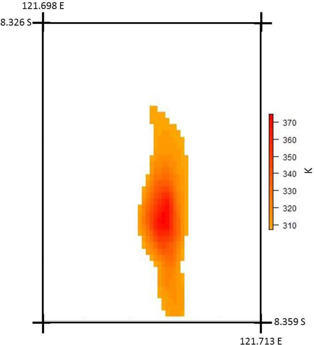 The thermal anomaly isolated in the Landsat-8 image of Paluweh was spread over 264 pixels (2.64 km2) (Figure 5). Given the intensity of the anomalous surface towards its northern centre, this precise area is assumed to represent the active lava dome, with the cooler pixels stemming north and south from it most likely representing active and/or cooling pyroclastic flows that were reported as associated with the eruption [29].