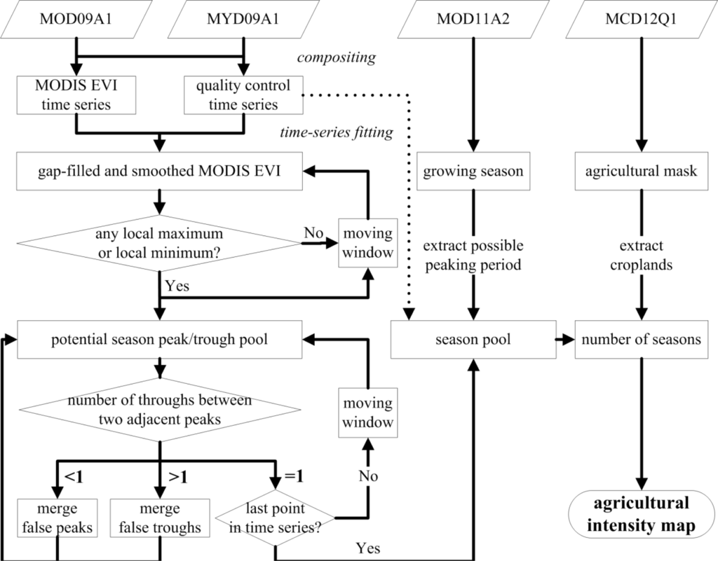 The workflow to map agricultural intensity is presented schematically in Figure 2. The algorithm consists of three main steps: (1) Time-series smoothing of MODIS EVI data, (2) identification of phenology cycles from the fitted EVI time series, and (3) incorporating ancillary MODIS data to produce a final map of agricultural intensity.