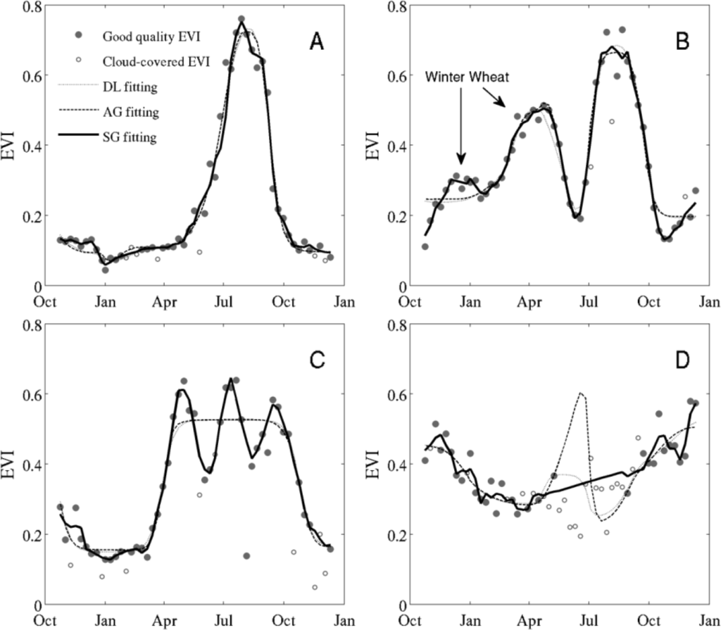 Our analysis suggests that the MODIS cloud product is conservative because some clear-sky observations are flagged as cloudy (Figure 3B,C). For cloudy areas, such as Southern China, high frequency and persistent missing data present substantial difficulties for capturing phenological variation in crops (Figure 3D). Successfully smoothed time series is therefore both important and challenging when continuous observations during the growing season are missing due to clouds.
