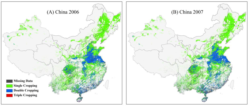 A number of previous studies have attempted to map cropping intensity in China [24,34,35]. However, operational mapping of agricultural intensity based on MODIS data remains a challenge for a variety of reasons. First, trajectories of MODIS EVI time series in croplands are highly variable over large areas [36,37]. For example, double cropping systems of wheat-maize or wheat-soybean dominate the North China Plain, while triple cropping systems, such as rice-rice-rice, wheat-rice-rice, or rape-rice-rice, are common in Southern China [22]. Many of these areas are managed in rotation systems, and planting dates are highly variable from year to year. Second, MODIS pixels frequently include a mixture of land-cover types that introduce scale-dependent errors in land cover maps [38]. Hence, separating multiple cropping from single cropping is especially difficult when both cropping strategies are located in the same pixel. Third, noise from cloud contamination, variable viewing and illumination angles, resampling procedures [39,40], or persistent missing data due to clouds in humid climates often introduce large amounts of noise and missing data in MODIS EVI time series. Finally, areas planted with winter wheat usually manifest double peaks (one before dormancy with a second in the spring) each year [1,41]. For all of the above-mentioned reasons, conventional remote sensing classification algorithms may not provide good results.
