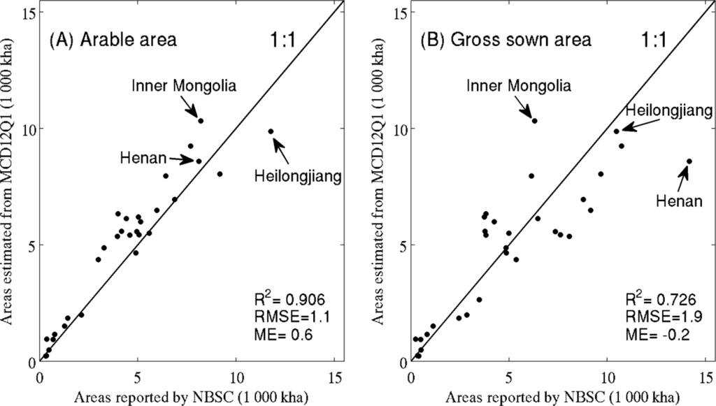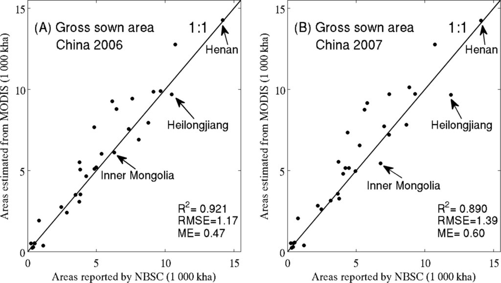 At the provincial level, we estimated the total agricultural area in each province from the MODIS Land Cover Type product and compared the results to national survey data in 2006. While the derived agricultural areas match well with the reported arable areas (Figure 7), the MODIS land cover product provides incomplete information related to agricultural land use (gross sown area), which incorporates multi-cropping. In Inner Mongolia, for example, gross sown areas are overestimated because off allow rotations; conversely, gross sown area is under estimated in top agricultural provinces, such as Henan, due to multiple croppings.