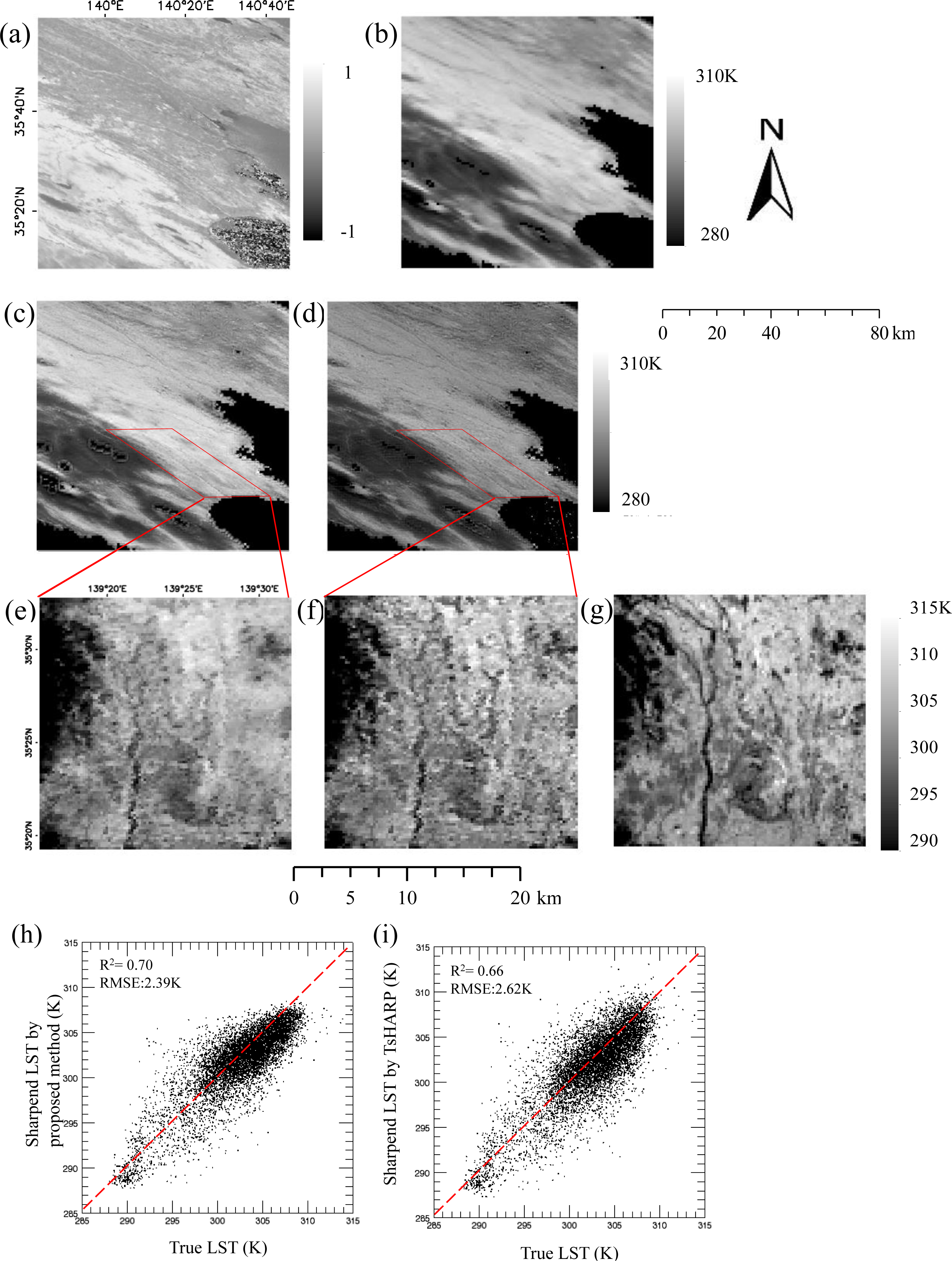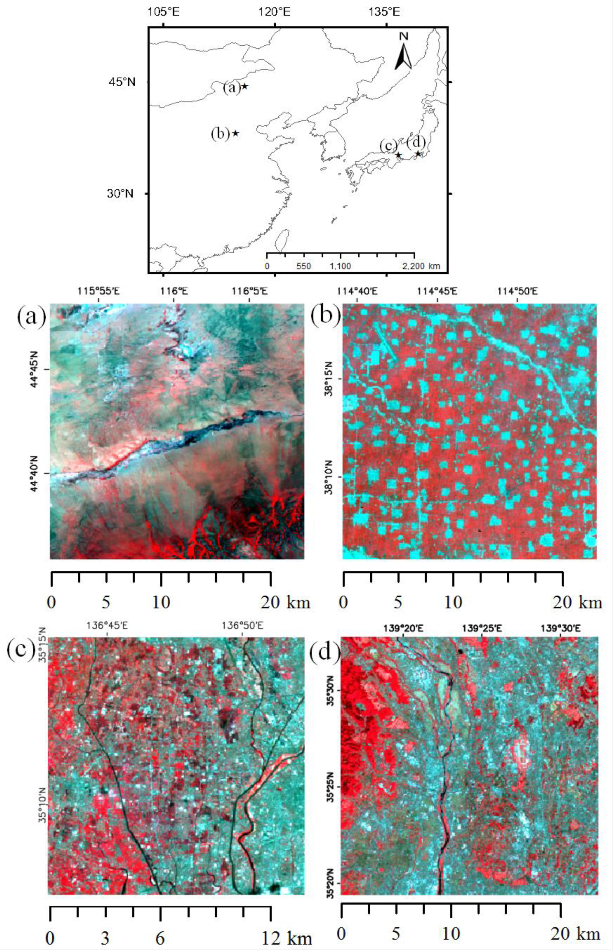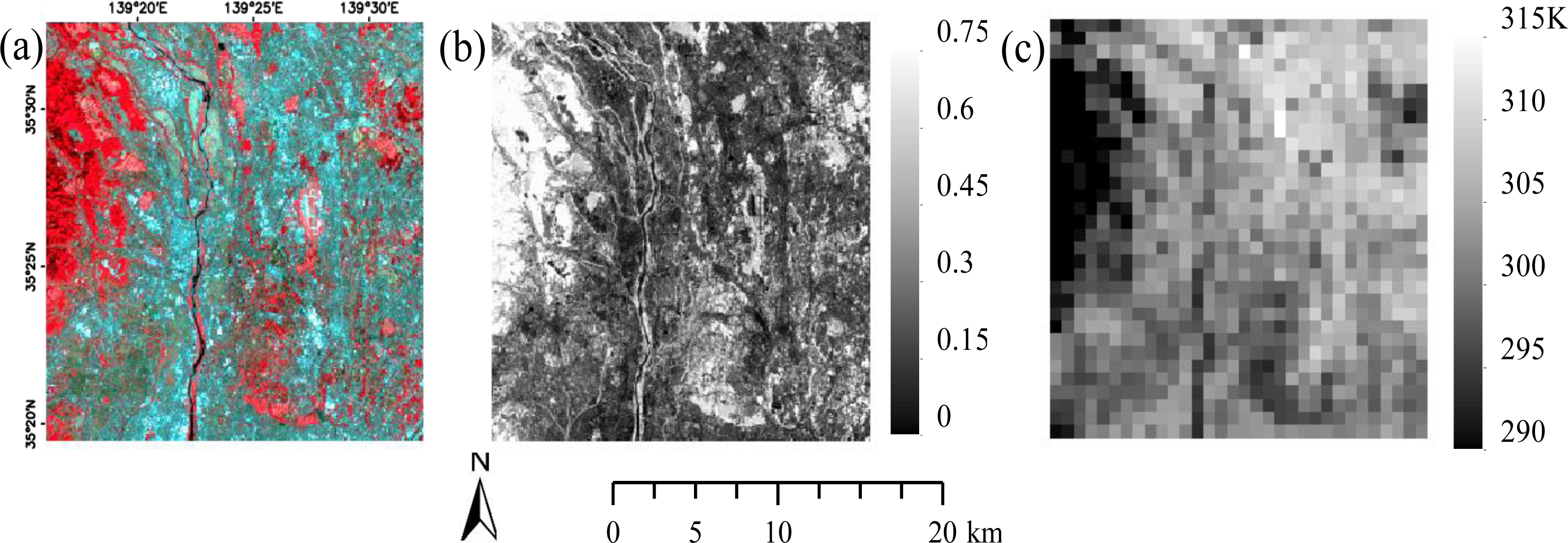 | b | ASTER | 26 April 2002 | Haihe river basin, China (38.3N, 114.7E) | Cropland (70%) | 256 × 256 (90 m) |