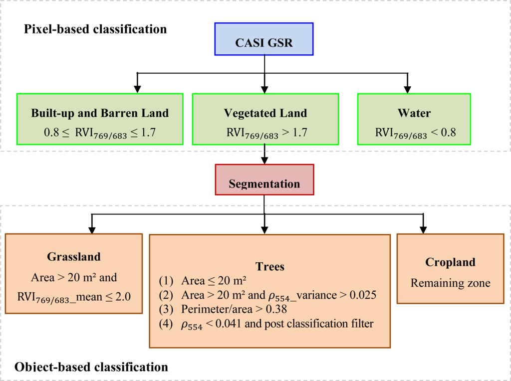 As shown in Figure 2, a hierarchical classification scheme [37–40] was employed to classify the CASI hyperspectral imagery: different hierarchical levels were separated using a pixel-based classification based on reflectance spectra, and different vegetation types were discriminated using object-based classification based on geometric and spectral features of objects segmented according to the spatial adjacent relationship. In the pixel-based classification, RVI thresholds discriminating three land cover types were set when the classification accuracy of the testing sample pixels from three land cover types reached its maximum value; in the object-based classification, thresholds discriminating a specific land cover type were set when the accuracy of the testing sample pixels from the specific land cover reached its maximum value. The land cover types in the CASI transects were mapped according to the above hierarchical classification process, as illustrated in Figure 3. (The result for one sub-region within the CASI transects is shown).