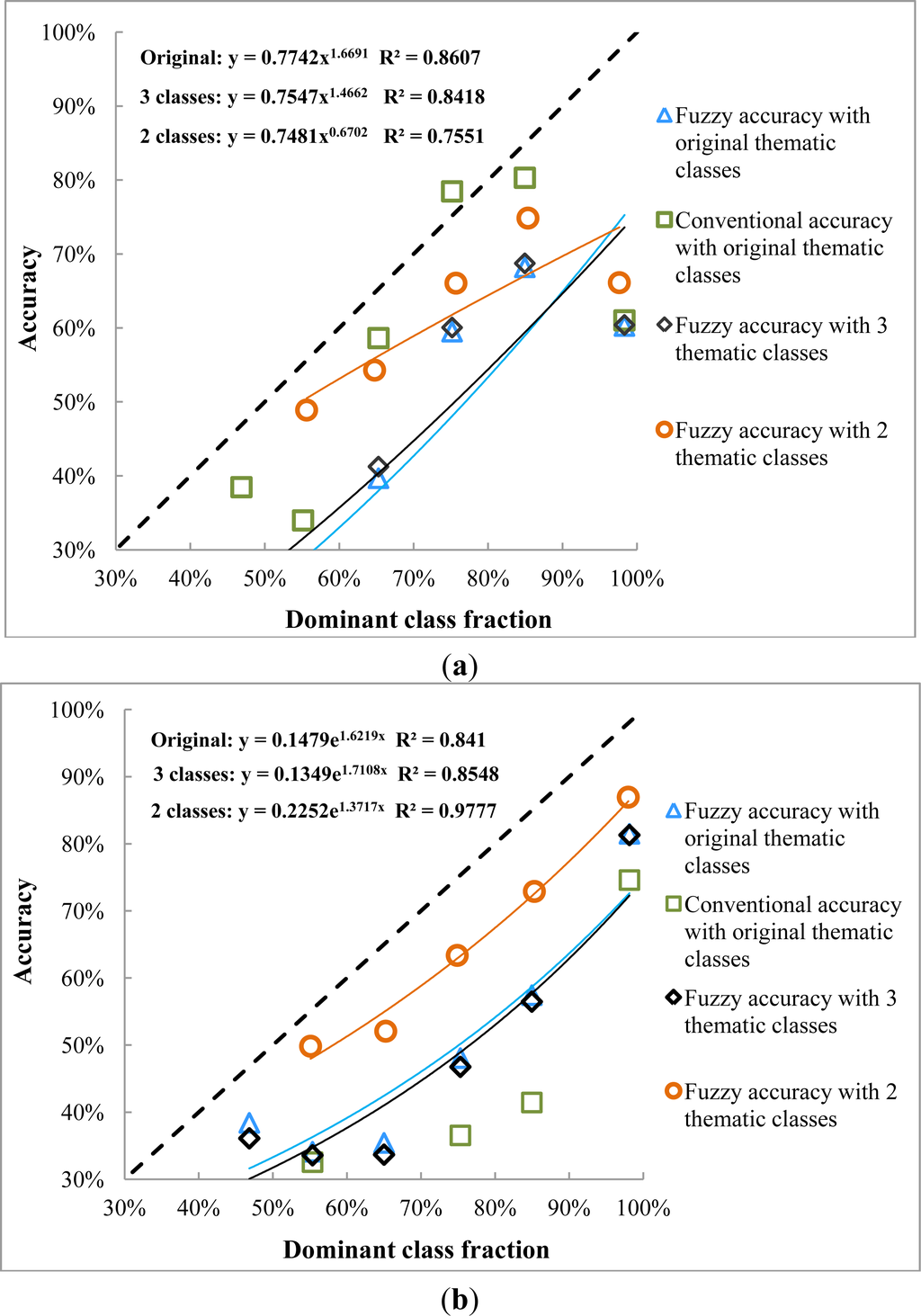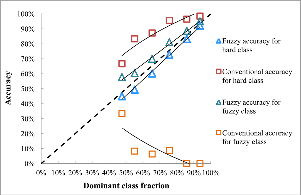 The conventional accuracy for the fuzzy class is very low and is characterized by a decreasing trend with increasing homogeneity as a result of the evaluation rule, which is stricter than the conventional evaluation for the hard class and which focuses on the correctness of both the dominant class and sub-dominant classes. It, therefore, becomes harder for a coarse-resolution pixel to be considered 100% correct, especially in a highly homogeneous area, where there are fewer sub-dominant classes. For the hard class, the conventional accuracy is higher than the dominant fraction and increases with increasing homogeneity.