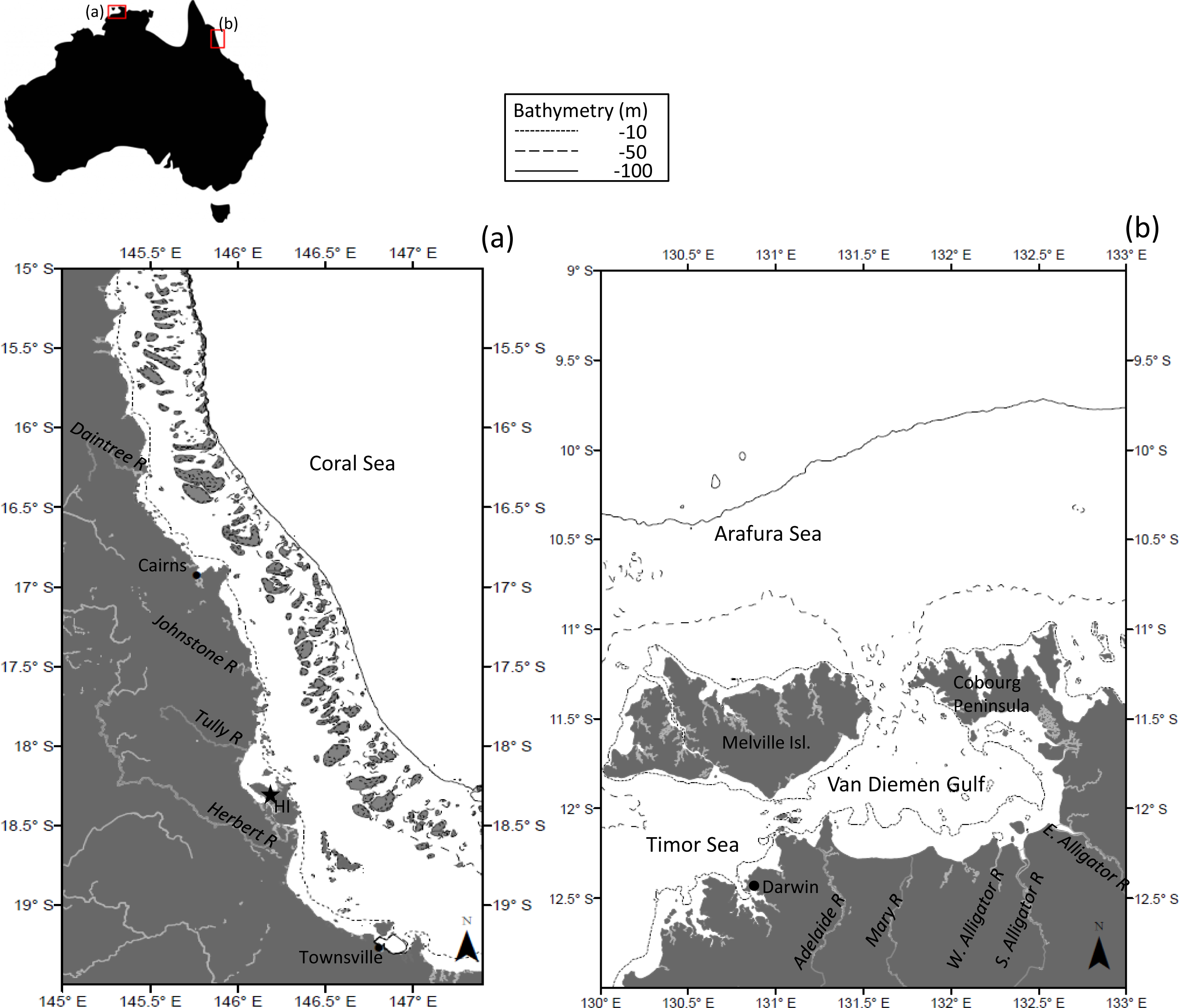 Maps showing the two tropical study regions. (a) The Great Barrier Reef (Wet tropics), Queensland. Hinchinbrook Island is shown as “HI”; (b) the Van Diemen Gulf, Northern Territory. The main rivers are indicated in italic and light grey. Isobaths (−10, −50, −100 m) are shown.