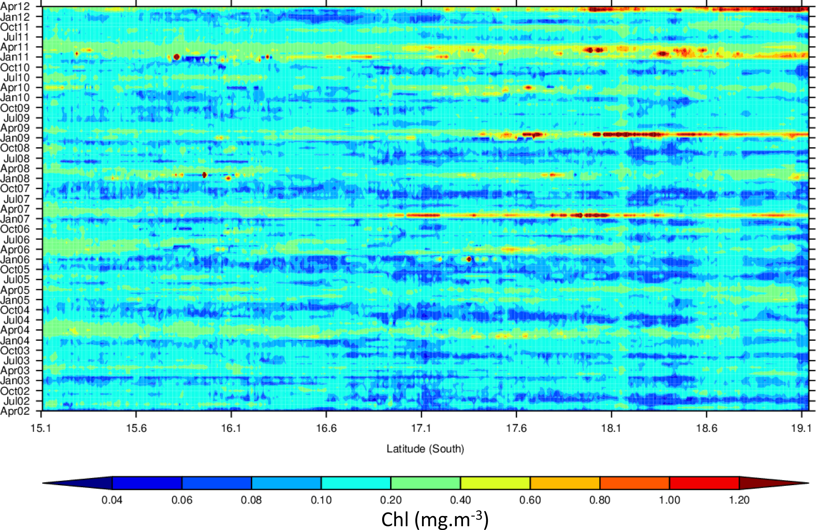 Latitude-time plot of Chl for the GBRW cluster.