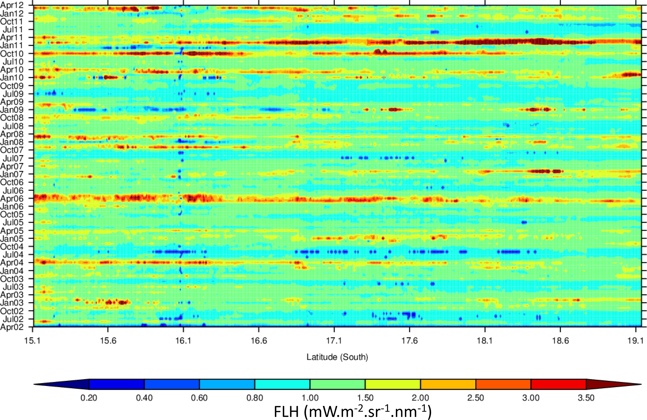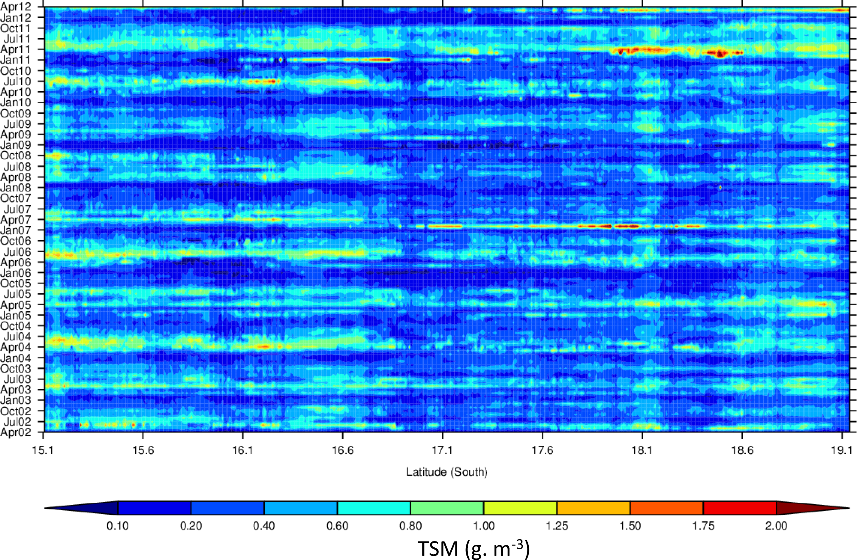 For the GBRW, the history of Chl (Figure 15) shows a seasonal increase in March–April from 0.04 to >0.40 mg·m−3. The increased frequency of land-to-coast water runoff after the start of the wet season in December in the GBRW generates a progressive build-up of nutrients in the near-shore waters between January–March. Spatially, the Chl seasonality displayed in the Hovmöller reflects that of the tile-plots. An increase in Chl over the years can be observed, mostly between 15–17.5°S. This increase in Chl seasonality tends to extend towards 19°S after 2007. The FLH (Figure 16) displays regular seasonal patterns that match those of Chl, albeit with greater increases outside of the seasonal peaks. A seasonal increase in FLH (∼0.1–1 mW·m−2·sr−1·nm−1) occurs regularly between October and April (wet season), and peaks between January and March (as per Chl). Spatially, FLH patterns in the Hovmöller also reflect the distribution of Chl. Temporally, as per Chl, FLH tends to increase over the years. TSM (Figure 17) displays mild changes (up to ∼2 g·m−3) for most years between 16.5–18°S.