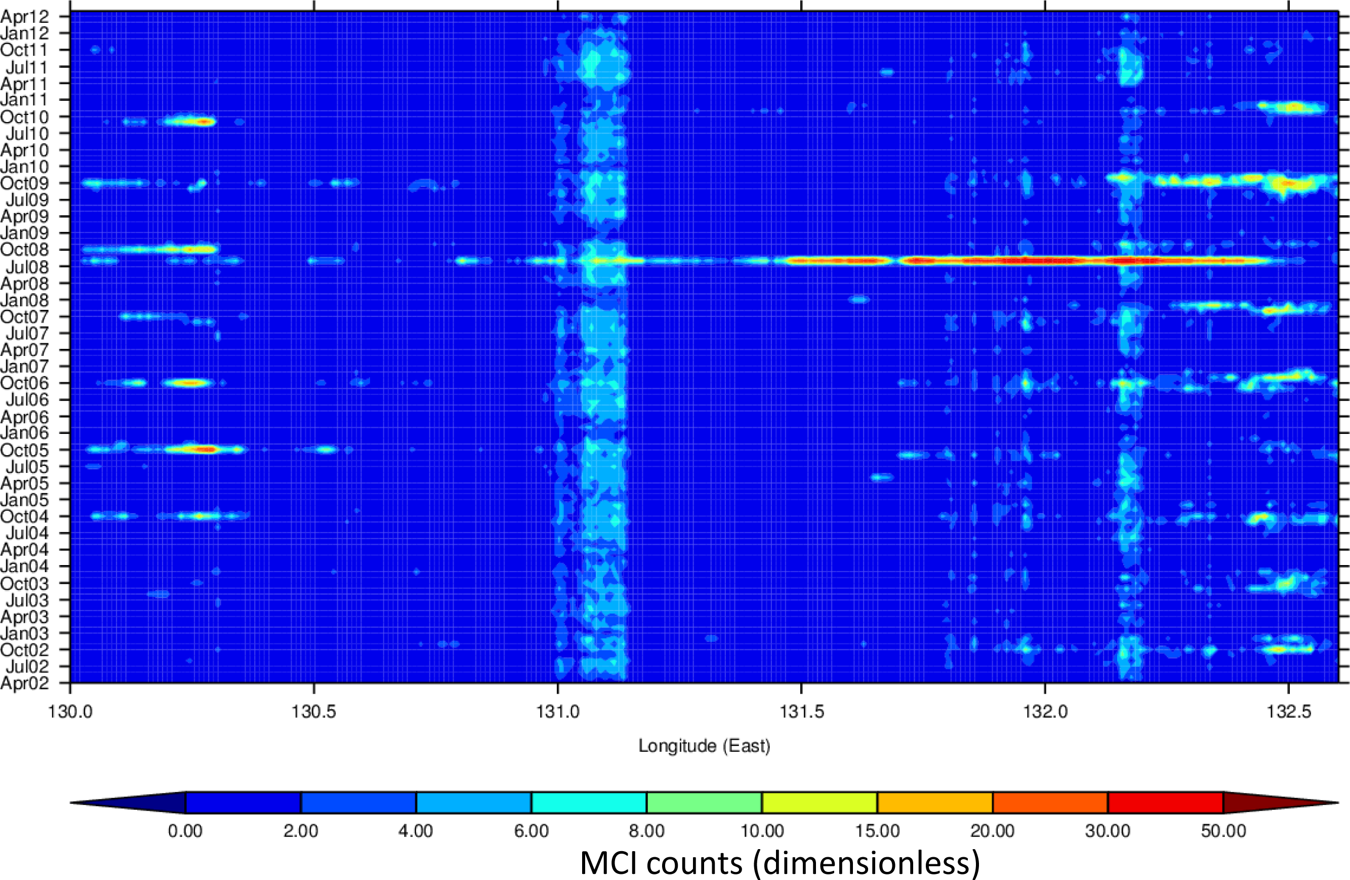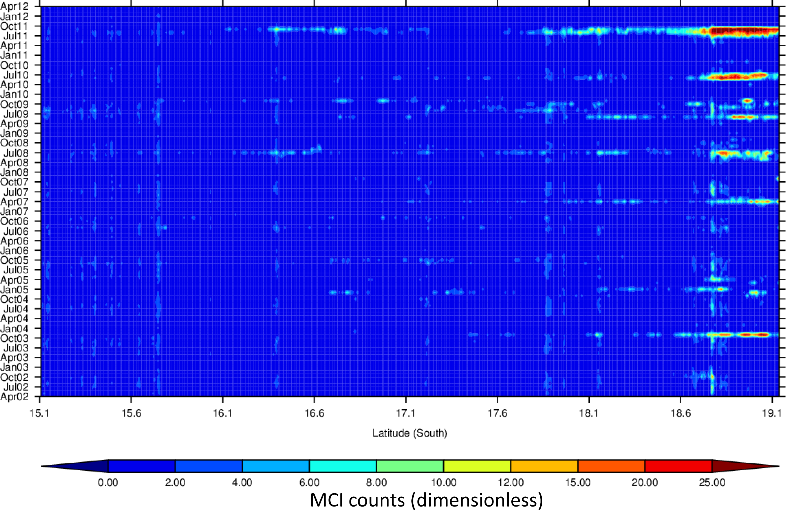 Latitude-time plot of MCI counts for the GBRW cluster. The surface bloom event of 30 July 2008 (Figure 2) can be seen (18.6–19.1°S).
