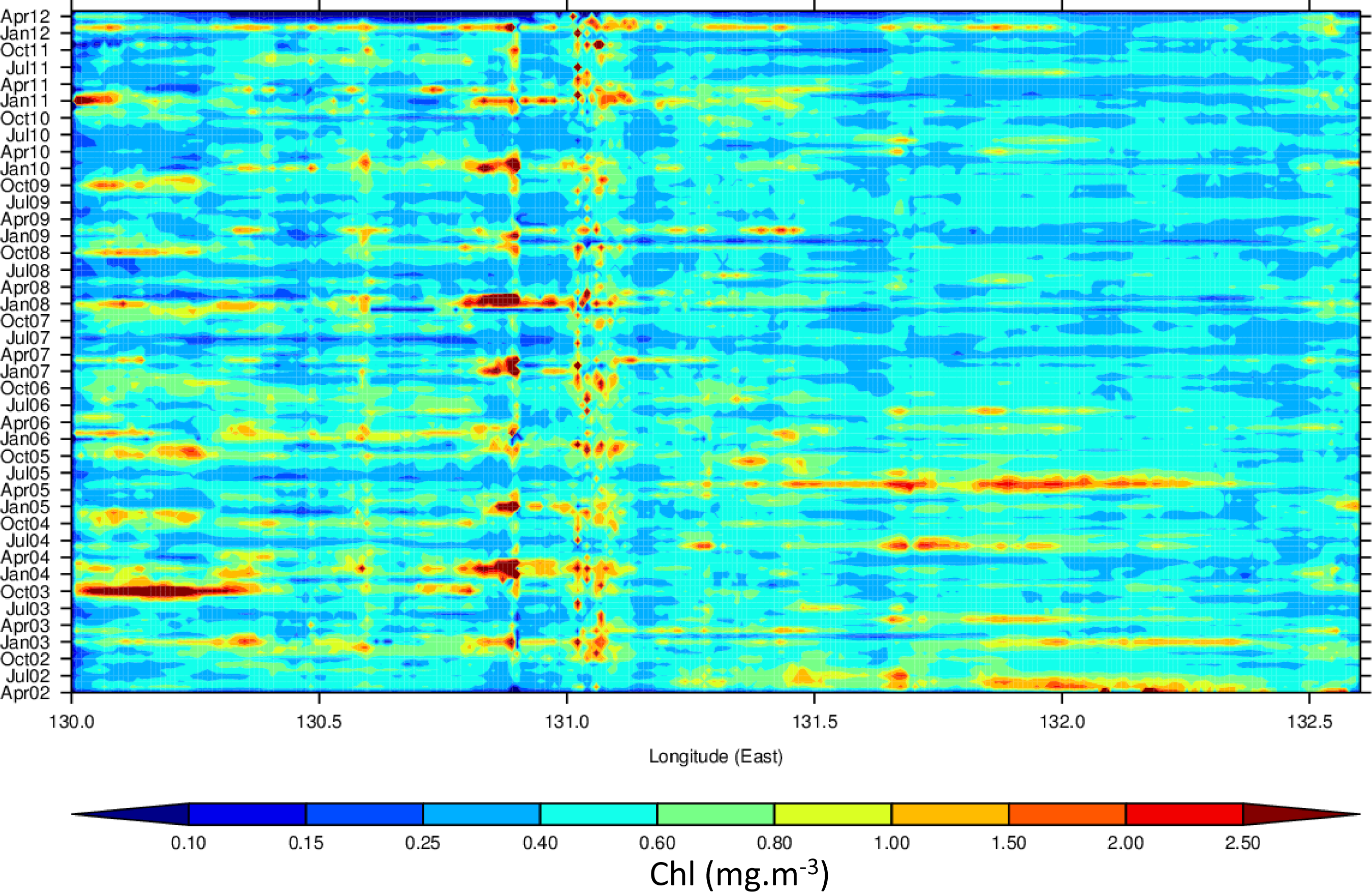 In the VDG, higher Chl (Figure 19) is observed primarily south-west of Darwin (130.25°) and near the Adelaide (131°E) and Alligator (131.5–132.5°E) rivers. The Chl signal increases in intensity (Chl > 1.25 mg·m−3) between October and November for the waters close to Darwin, around January for waters near the Adelaide River, and between April and July for the Alligator rivers. For the remainder of the year, Chl shows occasional increases (Chl∼1.0 mg·m−3) around January during episodic events.