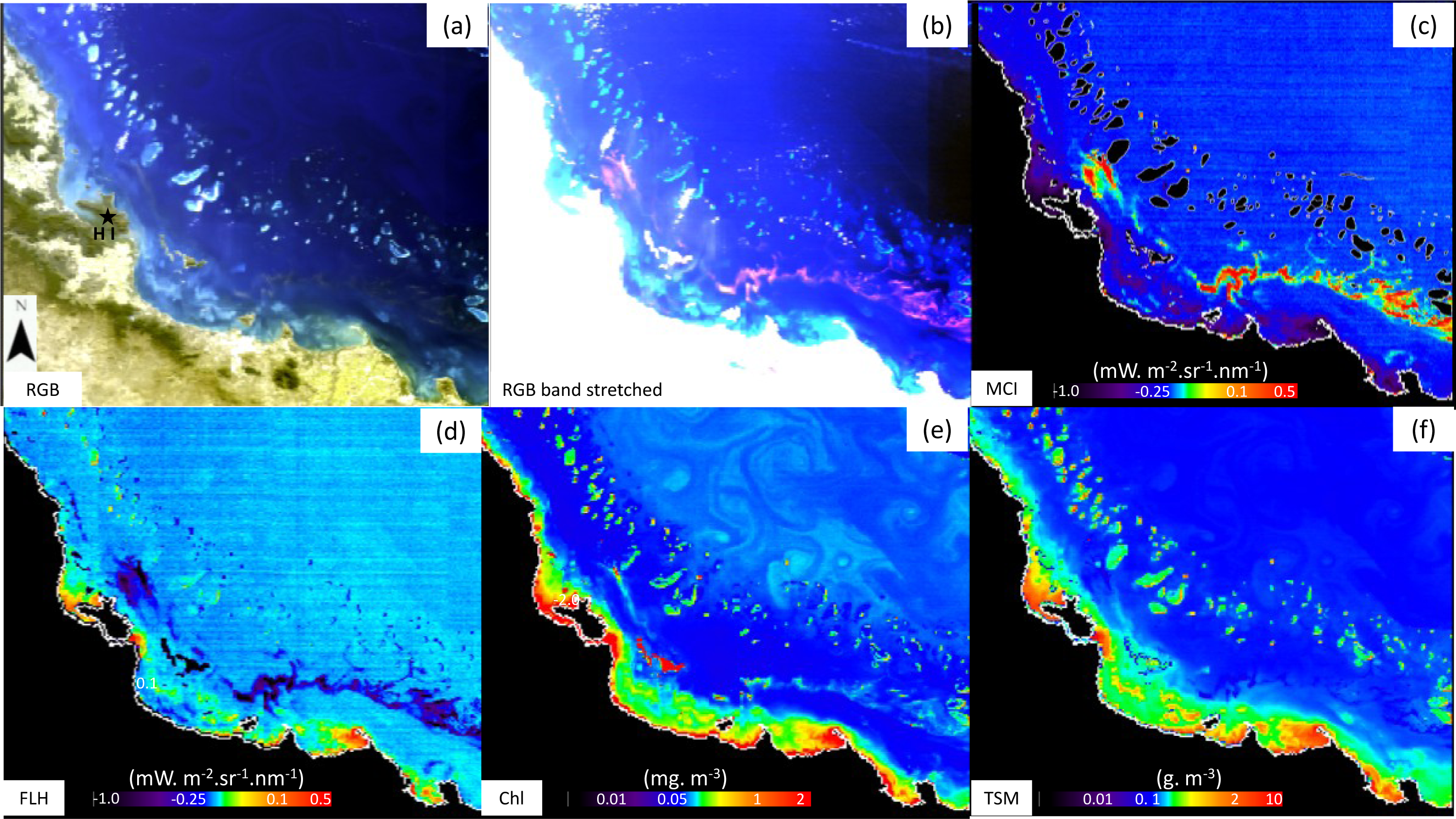 MEdium Resolution Imaging Spectrometer (MERIS) scene of 30 July 2008 for the Great Barrier Reef Wet tropics (GBRW), illustrating the potential of multiple MERIS products for algal blooms monitoring. A surface bloom occurs near Hinchinbrook Isl. (18.5°S; black star in (a)). The four MERIS products used for this study are shown. (a) RGB BEAM Tristimulus; (b) a band stretched image with MERIS bands 10, 7, 5; (c) Maximum Chlorophyll Index (MCI); (d) Fluorescence Line Height (FLH); (e) Free University Berlin (FUB) Chlorophyll-a (Chl) (algal 2) and (f) FUB Total Suspended Matter (TSM). The land (c–f) and Reef Matrix (c only) are masked in black.