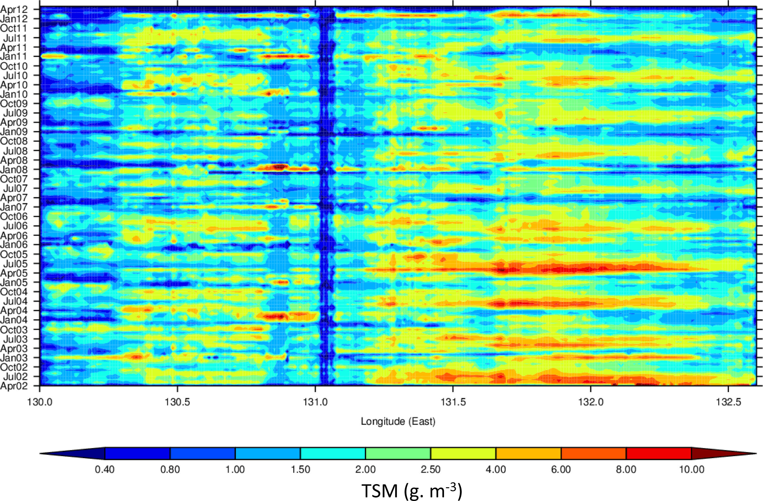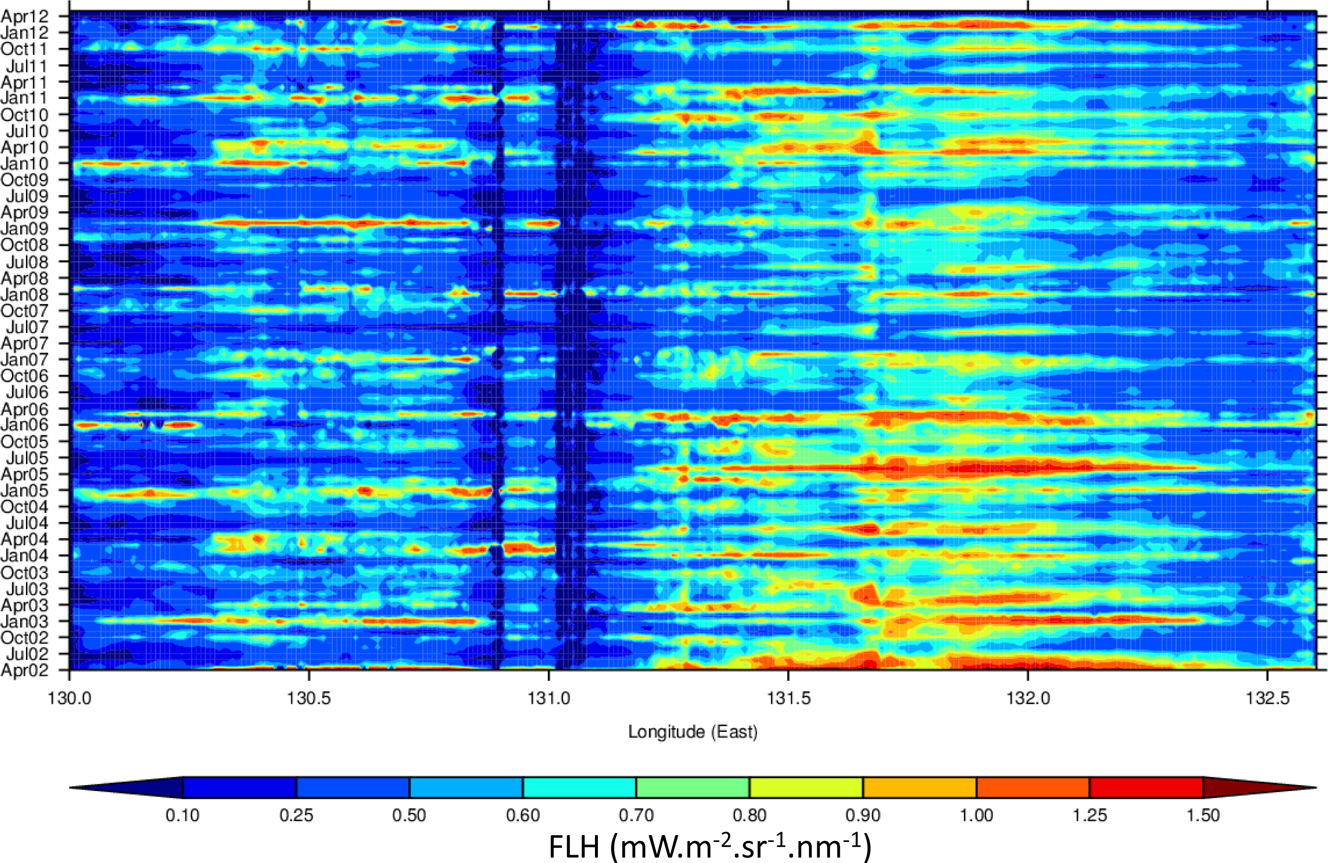 FLH (Figure 20) displays more complex patterns than those of Chl for the VDG. An increase in FLH (>1 mW·m−2·sr−1·nm−1) is observed between January and April for most of the VDG, but a much stronger seasonal signal occurs between April and July (as per the corresponding tile-plots) mainly near the Alligator Rivers (131.5–132.5°E). Episodic increases in FLH also occur mostly between September and October. Increase in TSM (Figure 21) is generally constrained to the dry season (May–September).