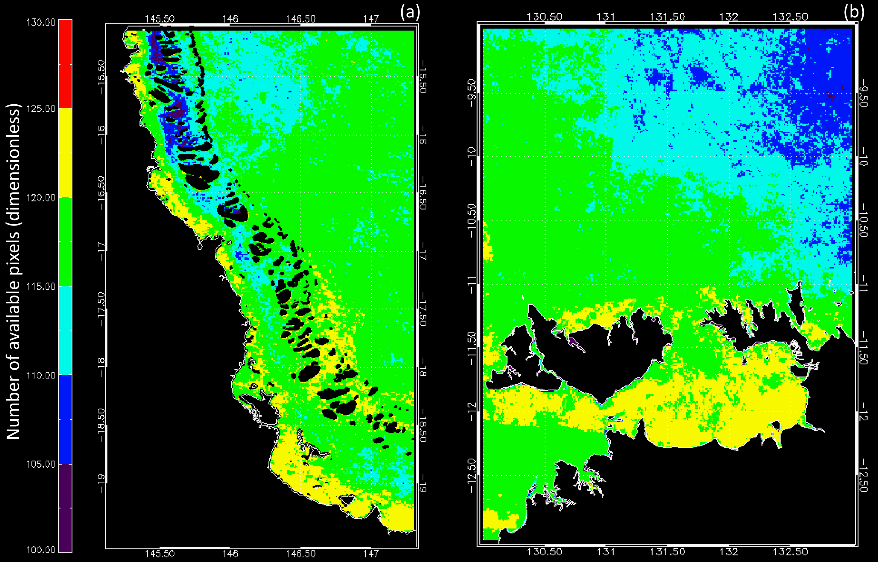 Satellite data observations for (a) the Great Barrier Reef Wet tropics (GBRW) and (b) the Van Diemen Gulf (VDG) over the MERIS mission (April 2002–April 2012). The number of available pixels was computed from monthly composites (N = 133).