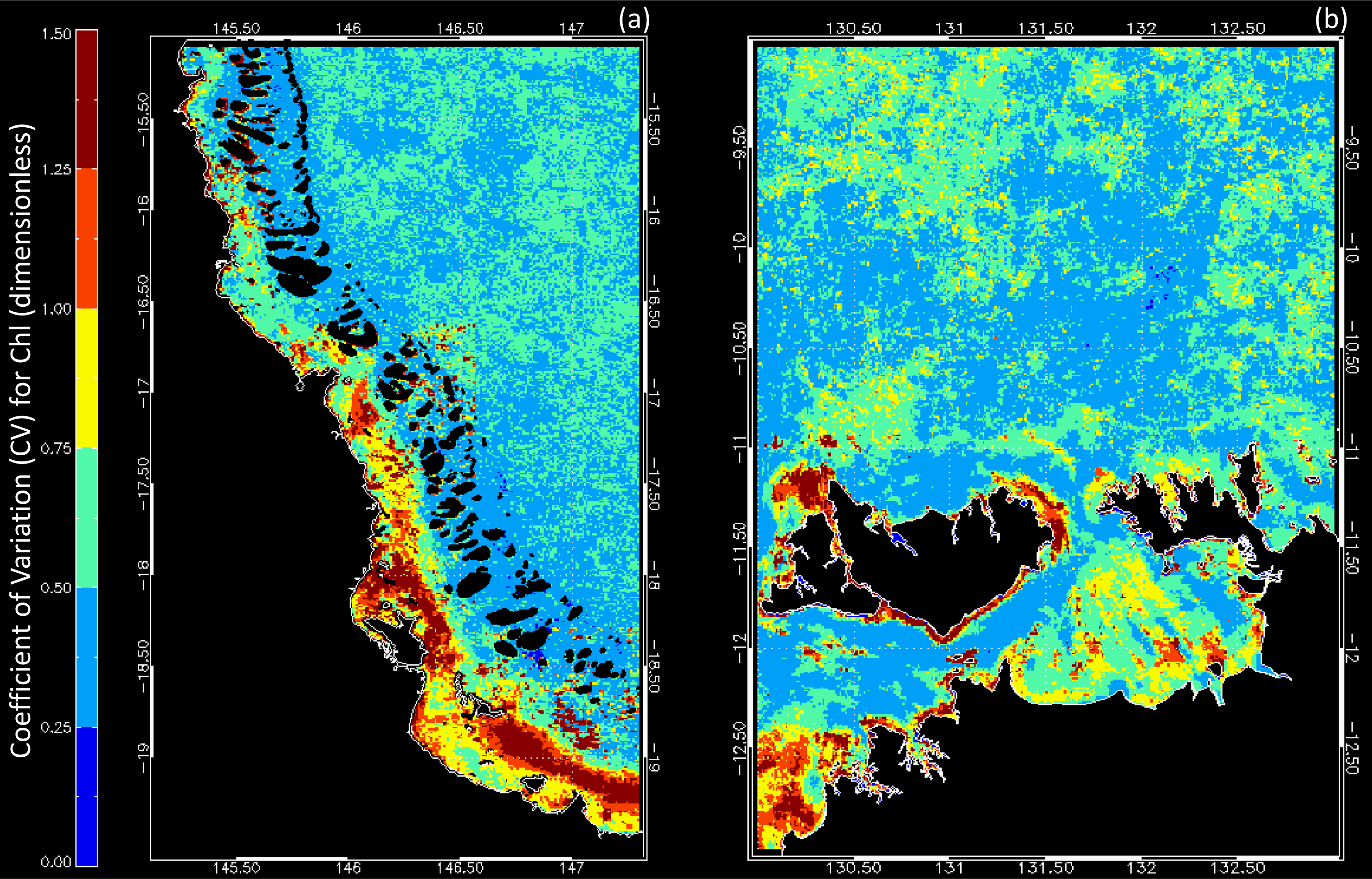 Variability in Chl for (a) the GBRW and (b) the VDG. The coefficient of variation (CV) was computed from monthly composites.