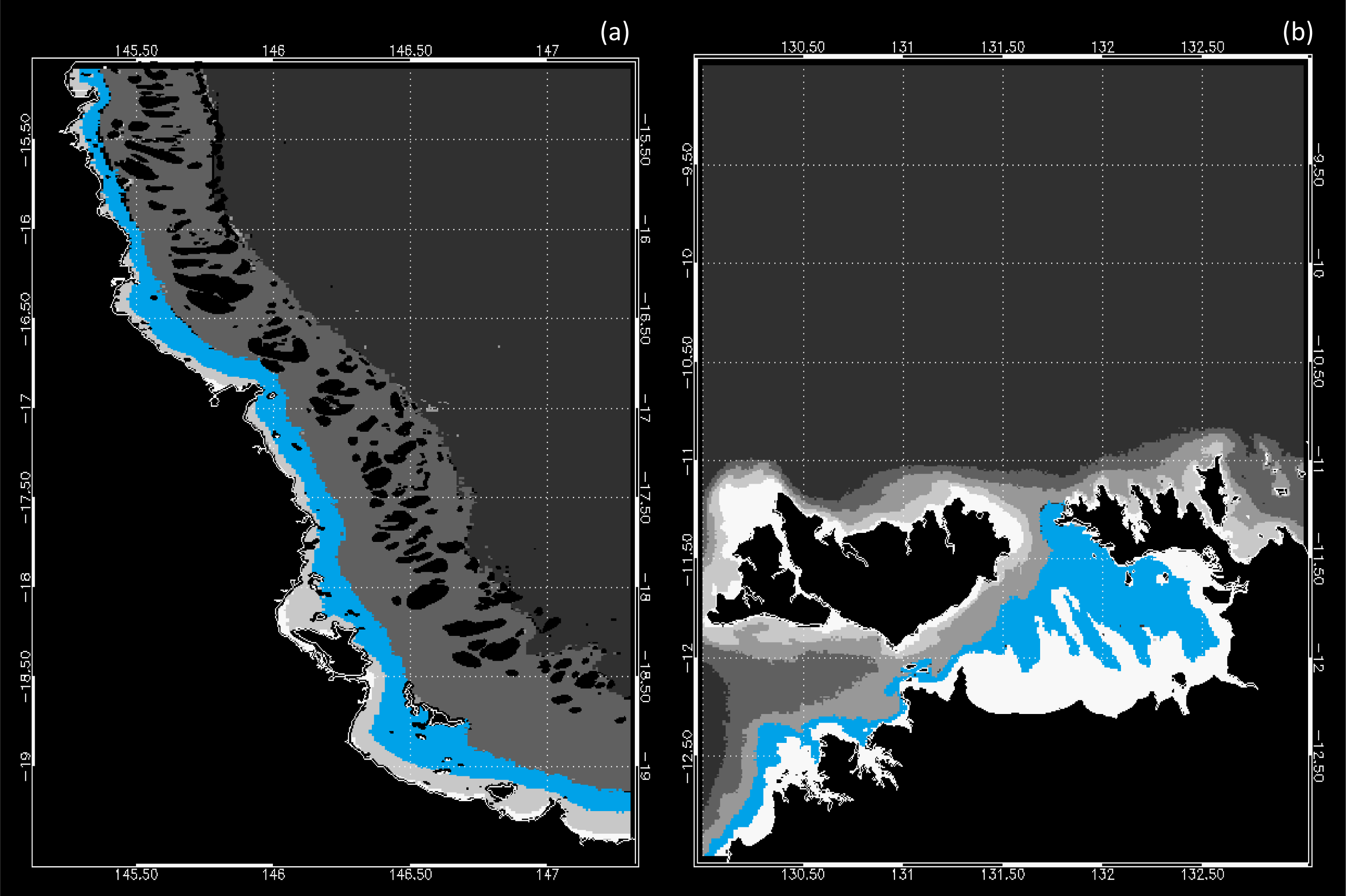 Spatial and temporal mapping of phytoplankton blooms has been undertaken in many parts of the world’s oceans, with a major emphasis on temperate coastal and oceanic waters where an annual spring bloom occurs [1,2]. Yet phytoplankton dynamics in tropical marine systems remains largely understudied. To address this knowledge gap, this study investigated the spatio-temporal distribution of phytoplankton blooms by means of satellite proxies in the context of the tropical waters of the Northern Great Barrier Reef (GBR, North Queensland) and the Van Diemen Gulf (VDG, Northern Territory), Australia. The coastal regions studied are Cairns (15.1°–19.5°S), located in the Great Barrier Reef Wet tropics (later referred as GBRW), and the VDG (9°–13°S). Both study regions are intricate, bio-diverse coastal ecosystems with a complex oceanography [3,4].
