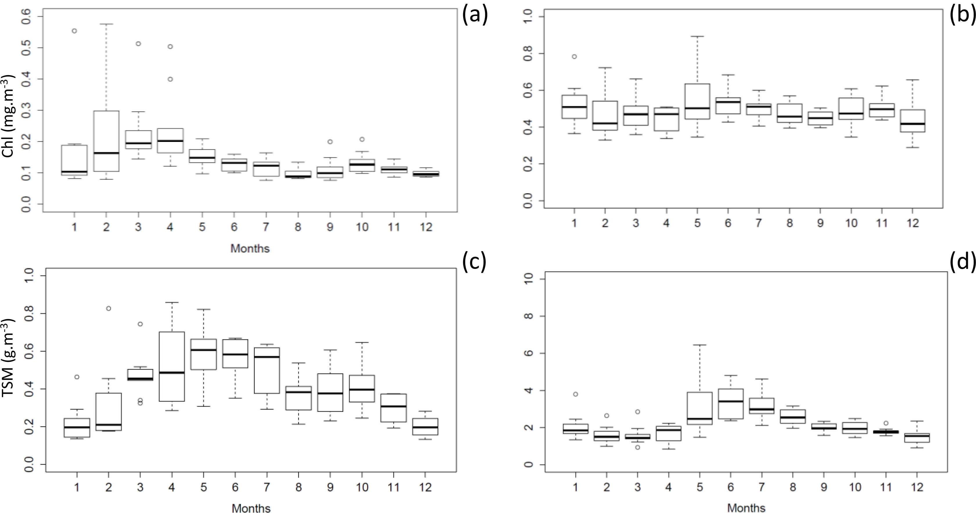Boxplots of monthly Chl and TSM for the GBRW (a,c) and VDG (b,d) clusters based on the MERIS 10-year dataset. The boundary of the box indicates the 25th and 75th percentiles, the line within the box indicates the median, the whiskers above and below the box indicate the 90th and 10th percentiles, and the dots outside the box are outlying values.