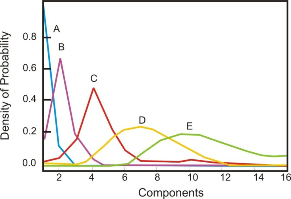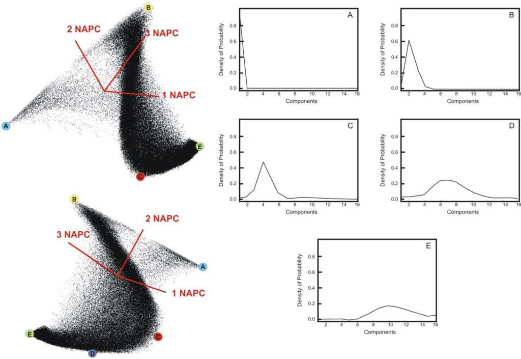 Probability density signatures in the study area (A, B, C, D and E curves).