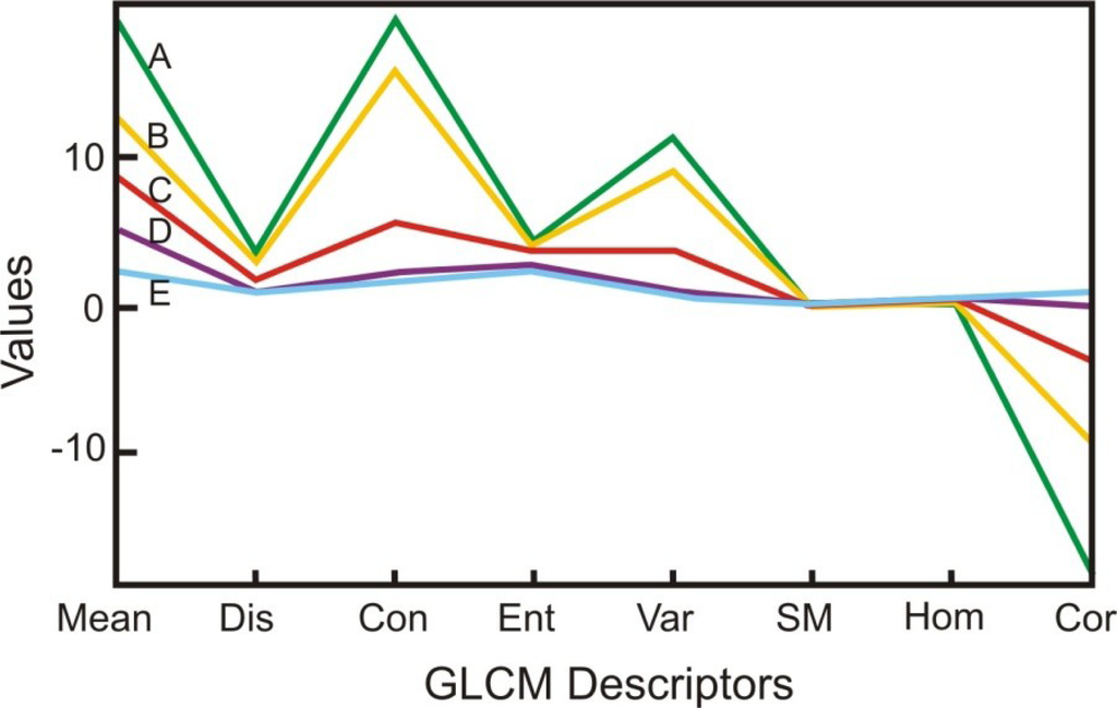 Originally, 14 statistical parameters were extracted from GLCM [1]. However, these statistical descriptors show a redundancy of information, requiring a prior selection before classification in order to obtain measures that tend to be independent compared to other co-occurrence statistics [62,68,77–79]. According to Clausi and Zhao [80], five features are most used in practice: contrast, correlation, dissimilarity, entropy and uniformity. Baraldi and Parmiggiani [77] considered energy and contrast as the most useful for discriminating different textural patterns. The homogeneity (or inverse difference moment) and contrast have strong negative correlation, as well as entropy and energy [77]. However, the definition of texture features depends on the type of target investigated. For example, the best texture features for oil spill monitoring are contrast, correlation, dissimilarity and variance [81], while for urban land cover classification, they are angular second moment, contrast, homogeneity and entropy [82].