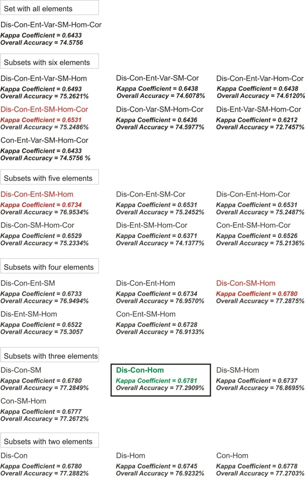In this paper, we used a “d” value equal to one, a single horizontal direction, a “G” value equal to 16 and a window size of 11 pixels. The choice of the last two parameters was to be compatible with the proposed method (PDC). Furthermore, the classification can use a number of possible combinations among the textural descriptors. The problem is to choose the best combination of variables to obtain a classification with the lowest error. In this work, a technique of sequential search was adopted to select the best set of textural descriptors. The sequential search method aims to maximize the textural-descriptor prediction while employing the smallest number of combination. The method starts with a classification including all textural descriptors, and the calculation of its respective kappa index, in relation to manual classification. In the next step, the set of descriptors is subdivided into new subsets with one variable less, performing new classifications. For example, a model with five variables is subdivided into five new subsets with four variables. The greatest kappa index determines the best model, which is again subdivided eliminating a textural descriptor. The procedure continues, eliminating descriptors, until there is an improvement in predictive accuracy. The process stops, if the kappa index of the best model of n-elements was less than the best model of n − 1 elements. This procedure was used for the combinations of the seven main GLCM descriptors: dissimilarity (Dis), contrast (Cont), entropy (En), variance (Var), second-moment (SM), homogeneity (Hom), and correlation (Cor).
