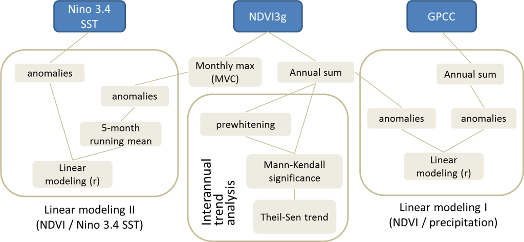 The seasonal and inter-annual development of NDVI as a proxy for vegetation greenness is closely linked to the occurrence and spatio-temporal distribution of precipitation in semi-arid areas. Hence, a significant relation between NDVI and precipitation should turn up as a result of a correlation analysis. Consequently, alterations in the precipitation cycle are assumed to show an impact on vegetation greenness. Based on these two fundamental causal preconditions, the strength of the linear association between annual NDVI and precipitation, as well as between monthly NDVI and Nino 3.4 SST was assessed by calculating the Pearson product moment correlation coefficient (r). The significance of the relations was tested against a threshold of the p-statistic with p = 0.01. Summed annual NDVI and precipitation values enabled the direct comparison of both variables without taking possible lags between them into account. On the other hand, the analysis of monthly values for the NDVI/ENSO relation allowed for a detailed observation of those lags at monthly intervals that provide key information about the existence and spatial inhomogeneity of the ENSO impact in the study area. All relations were tested for the 29-year time series, starting in January, 1982. A summary of the entire processing and analysis workflow is given in Figure 2.