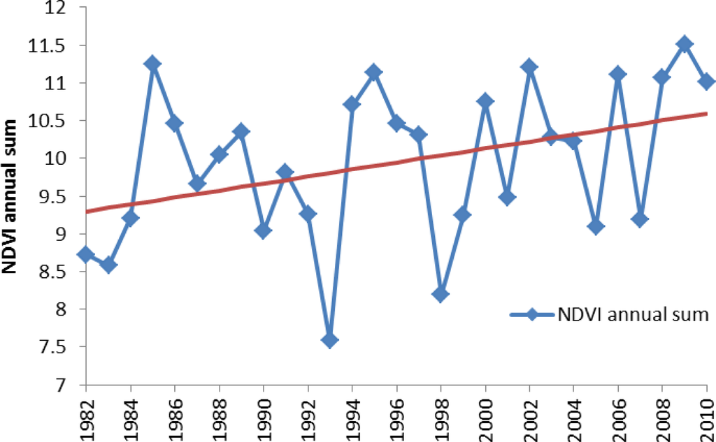 At the same time, the bi-monthly time series were aggregated to annual NDVI values, using the annual sum of NDVI as the key indicator for long-term inter-annual trend analysis. The annual sum of NDVI was chosen, because it reflects vegetation greenness throughout the year. All NDVI time series were finally adjusted for seasonality effects by computing anomalies to the long-term mean for both monthly and annual data.