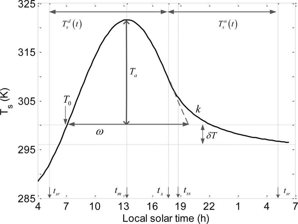 One should keep in mind that (1) these two models have been developed under clear-sky conditions without significant changes in wind speed; (2) these two models assume the temperature decays freely after “thermal sunset” at time ts; and (3) these two models cannot be used with satellite observations less than four times for each day, which is the case encountered in many regions of the world.