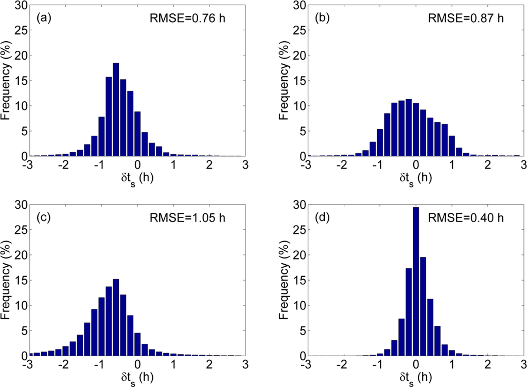 Before evaluating the performance of the 4-parameter DTC model, we compared the values of ts obtained from model fitting (i.e., ts treated as a free parameter) and those of ts estimated from tss−1. Histograms of the differences between ts obtained from model fitting and ts estimated from tss−1 for all cloud-free pixels on 28 January, 9 April, 31 July, and 1 October 2010 are shown in Figure 3. The root mean square error (RMSE) values of the ts differences are 0.76 h, 0.87 h, 1.05 h, and 0.40 h on 28 January, 9 April, 31 July, and 1 October 2010, respectively.