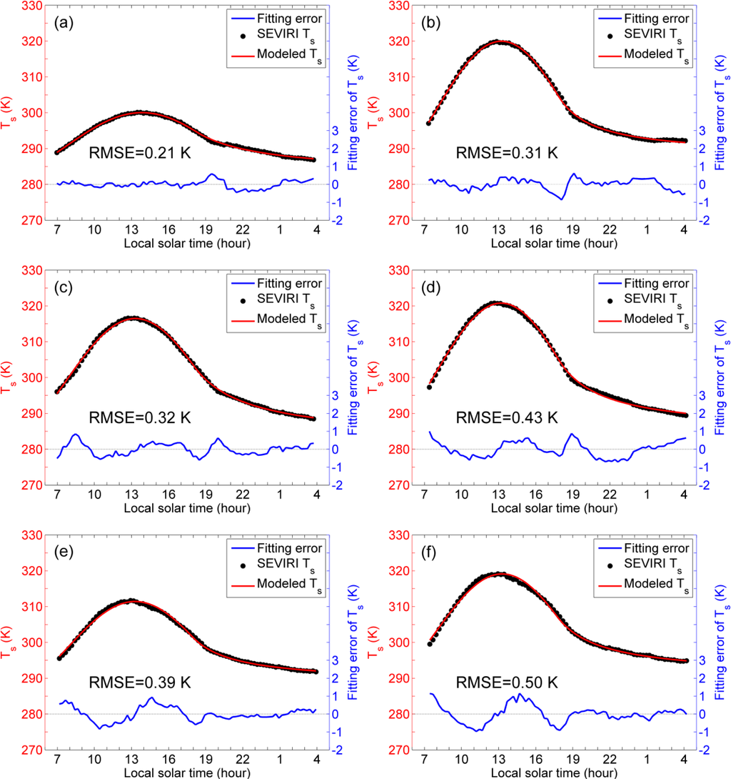 Fitting the 4-parameter DTC model to the diurnal cycle of the MSG-SEVIRI-derived LST on 31 July 2010 for the six selected pixels over different land cover types: (a) forest, (b) shrubland, (c) woodland, (d) grassland, (e) cropland, and (f) unvegetated land. Fitting errors of LST are also shown.