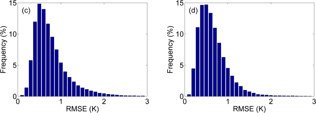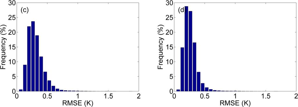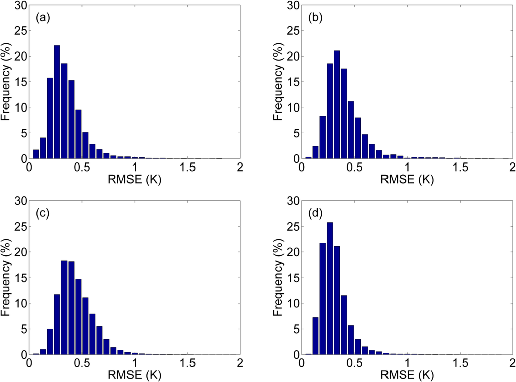 We used all cloud-free pixels on 28 January, 9 April, 31 July, and 1 October 2010 to statistically evaluate the performance of the 4-parameter DTC model. Figure 5 shows the histograms of the RMSE values of the 4-parameter DTC model fitting the diurnal cycle of the MSG-SEVIRI-derived LST on these four days. The fitting accuracy of the 4-parameter model is achieved with RMSE values less than 1 K for most pixels. The performance of the 4-parameter model depends on the quality of LST as well as on atmospheric and surface-wind conditions.