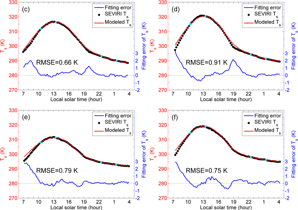 Because MODIS provides at most four observations per day at a given location, the 4-parameter DTC model was used to fit only four MSG-SEVIRI-derived LSTs corresponding to the MODIS overpass times (10:30, 13:30, 22:30, and 01:30 local solar time). The remaining LSTs were used to evaluate the accuracies of the 4-parameter DTC model fitting only four observations. The results show that the accuracies of the 4-parameter DTC model fitting only four MSG-SEVIRI-derived LSTs are approximately two times larger than those of the 4-parameter DTC model fitting all LSTs.