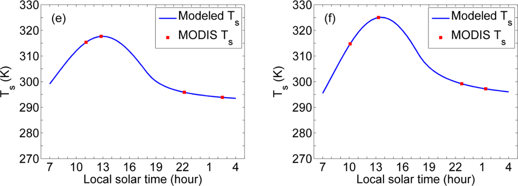 The diurnal cycle of LST has been used for a wide variety of applications. For example, the diurnal cycle of LST was used to analyze the urban thermal environment [11–14]. In addition, the diurnal cycle of LST was used to normalize the satellite-derived LSTs at different times to the same time [15,16]. Jin and Treadon [17] used the diurnal cycle of LST to correct the orbit drift effects on the National Oceanic and Atmospheric Administration (NOAA) Advanced Very-High-Resolution Radiometer (AVHRR) LST measurements. Schroedter-Homscheidt et al. [18] retrieved total water vapor column from Meteosat Second Generation-Spinning Enhanced Visible and Infrared Imager (MSG-SEVIRI) data with the aid of the diurnal cycle of LST.