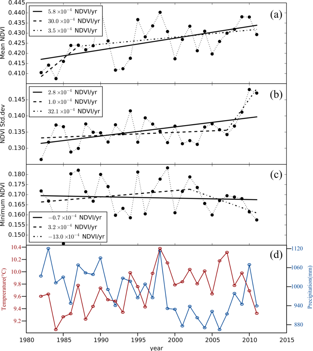 Trends of (a) annual mean; (b) standard deviation and (c) minimum of NDVI and (d) air temperature/precipitation, from 1982 to 2011. Solid line is the linear regressive line. The dashed line is piecewise regressive line.