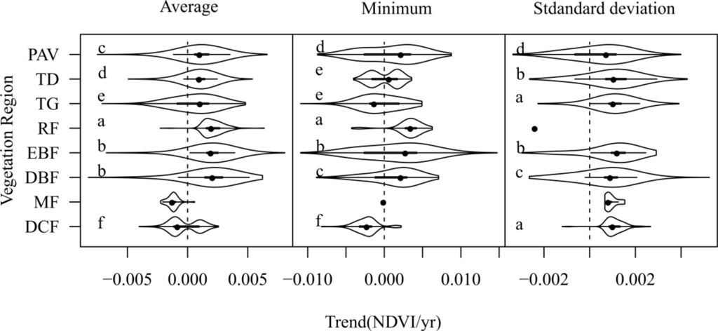 Violin plots of trends of annual average/minimum/standard deviation of NDVI at each pixel in each vegetation region. The black dots indicate the mean values; the short-segments indicate the interquartile range, as in standard box plots. Overlaid on them are kernel density estimations. Grouping results of Games-Howell post hoc pairwise comparison analyses are labeled with letters on the left. Regions with an insufficient number of pixels (<100) with significant trends were excluded from post hoc tests. Vegetation regions with the same letter have insignificant differences in trends. Average trends from positive to negative are labeled in alphabetical order.