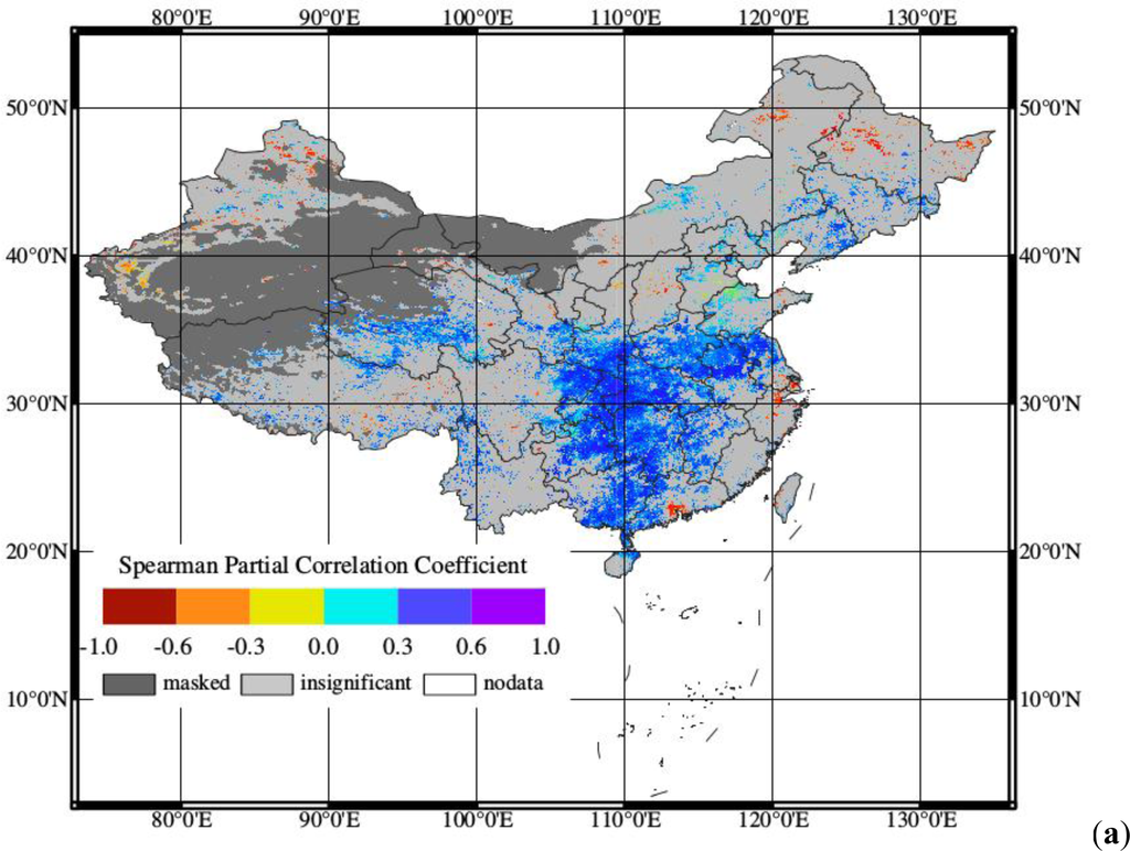 In addition, we applied Spearman partial correlation analysis to the monthly and annual NDVI time series data and climate factors (temperature and precipitation) to provide robust insights into their correlations, taking into account the nonlinear relationship and interaction between dynamic vegetation indices and climatic variables (temperature and precipitation). A lag time is defined as the number of months after which the NDVI shows the highest significant positive correlation coefficient with previous temperature or precipitation. The lag time is assumed to be limited to less than 6 months, based on the Ren et al. [63] finding that the effect of climate factors can persist into the next season.