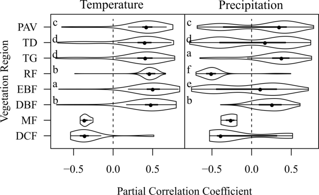 Violin plots of correlation coefficients between annual NDVI and temperature and precipitation at each pixel in each vegetation region. Grouping results of Games-Howell post hoc pairwise comparison analysis are labeled with letters at left. Regions with an insufficient number of pixels (<100) with significant correlations are excluded from post hoc tests. Vegetation regions with the same letters have insignificant differences in correlations. Average correlations from positive to negative are labeled in alphabetical order.