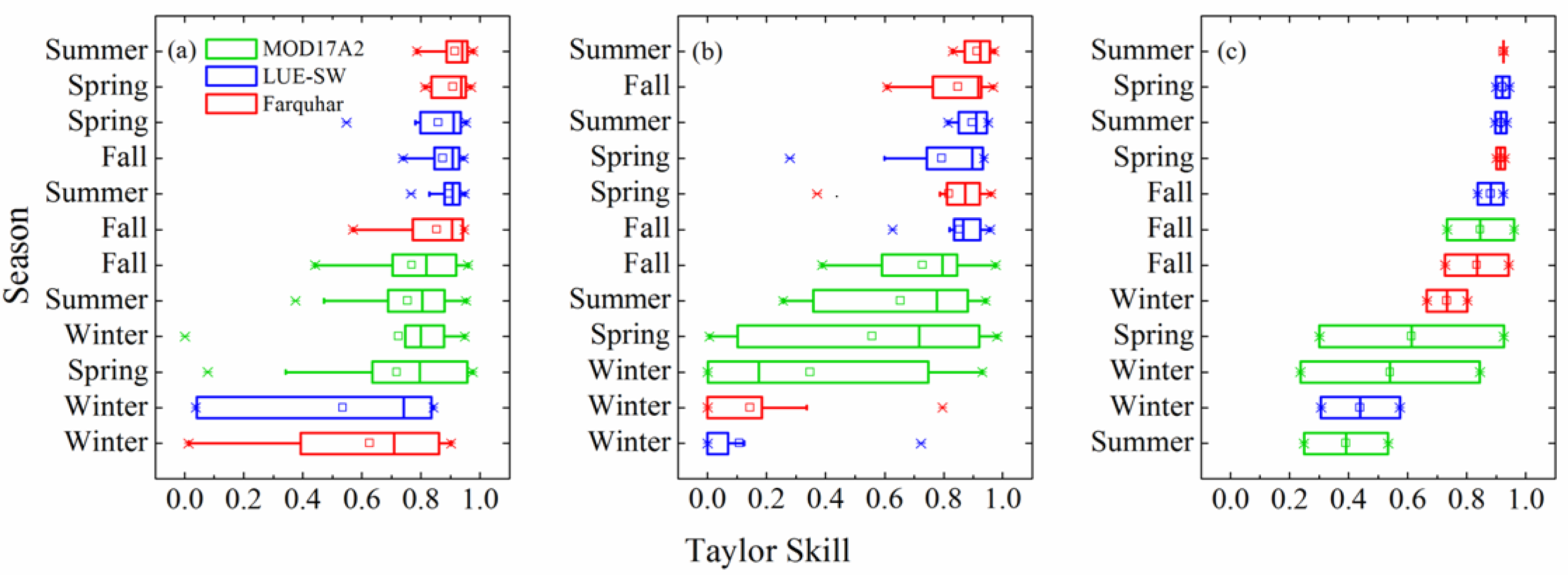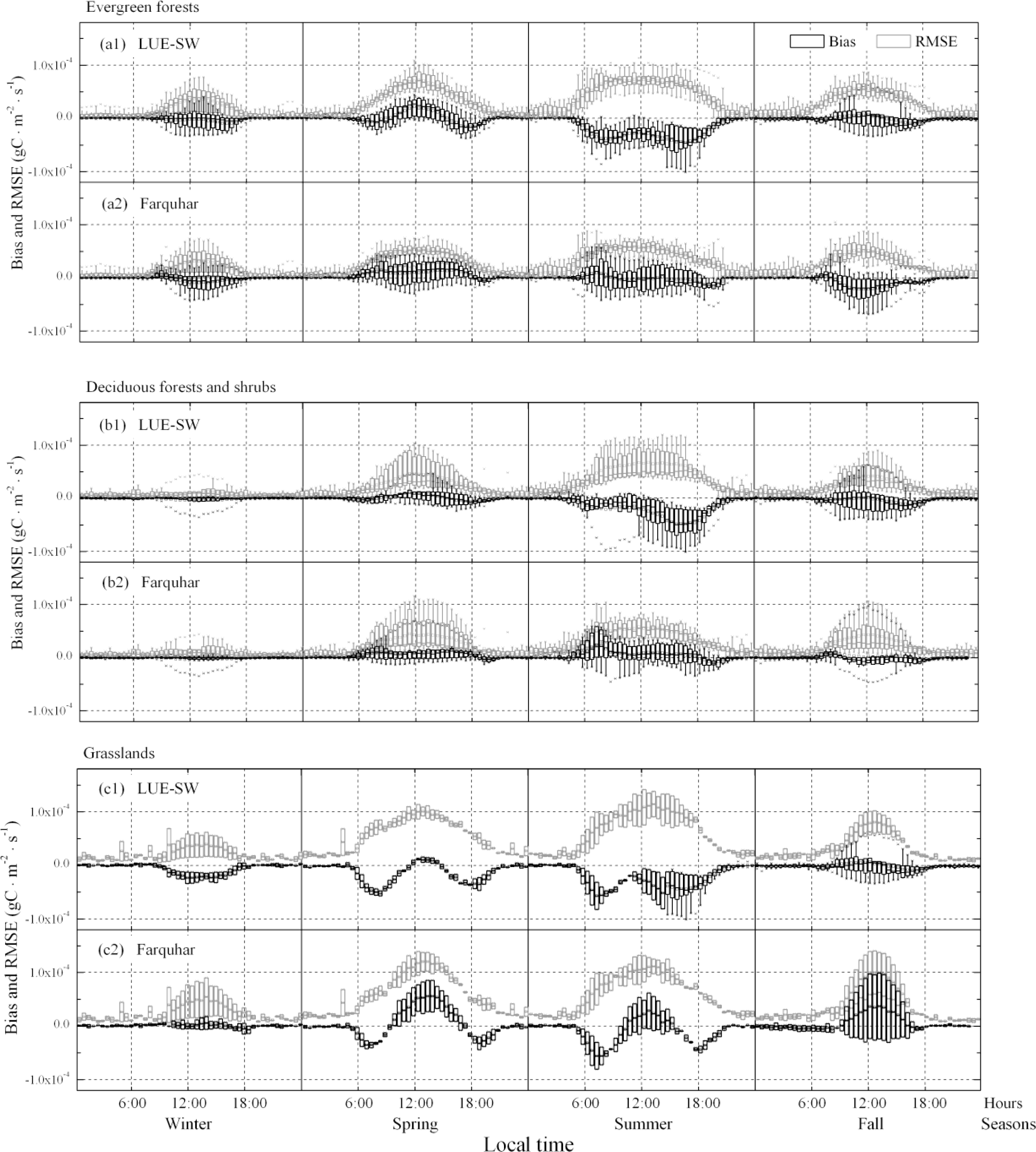 | Months/Seasons | MOD17A2 | LUE | LUE-SW | Farquhar | ||||