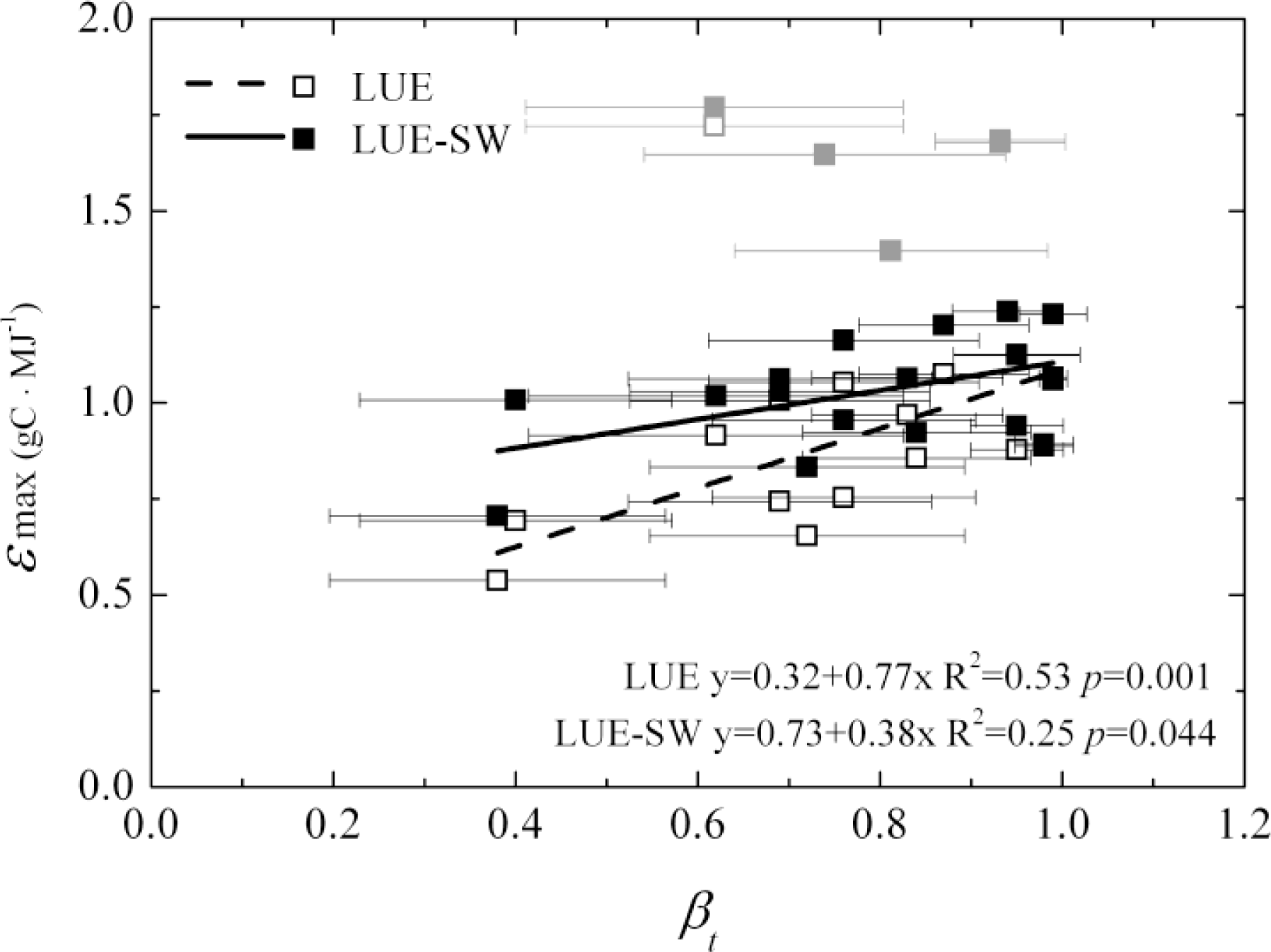- Optimizing the key parameter ɛmax in the MODIS GPP algorithm can compensate the errors caused by ignoring soil water factor at the site level, but the ɛmax values would have large uncertainties among sites within the same PFT and among the PFTs, especially for sites with low yearly average soil water factors. This result casts doubt on the accuracy of simulated spatial distribution of GPP yielded by the MODIS algorithm. Moreover, GPP was underestimated by the one-leaf models in summer, regardless of whether the soil water factor was considered, but could be improved by separating the canopy structure into sunlit and shaded parts. This result indicates that improving model structure is a better choice than only adjusting parameters. Photosynthetic dynamics in spring and fall for forests and shrubs and seasonal GPP change for grasslands could not be captured by both one-leaf and two-leaf models. Therefore, there is a need to improve seasonal and phenology variations of key parameters and variables in carbon assimilation calculation to reduce uncertainties in GPP simulation.