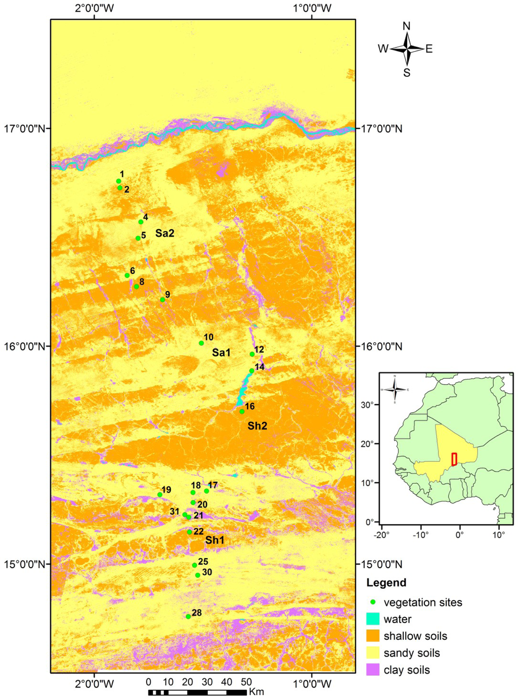 Map of the central Gourma, in Sahelian Mali, portraying the different soil types and the network of long-term ecological survey sites. The map is derived from a supervised classification of soil types and water bodies from Landsat images. The subset shown here corresponds to the area over which GIMMS-3g data are averaged, referred to as the “Gourma window” in this article. Sa1 and Sa2 refer to two specific sandy soil units for which further investigation was performed (see Section 3.6). Similarly, Sh1 and Sh2 refer to two specific shallow soil units.