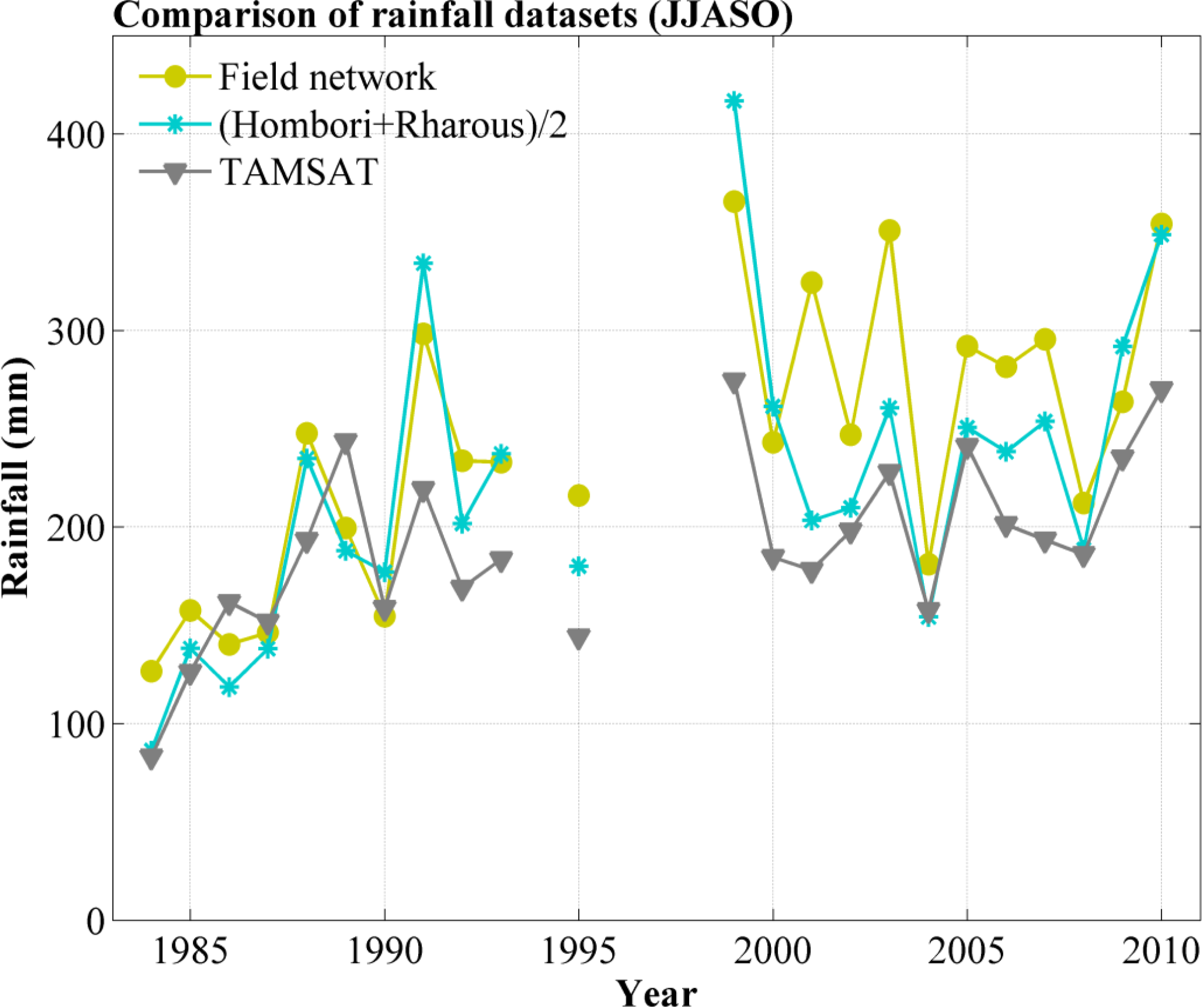 Comparison of various rainfall datasets: field network (average of rain gauges co-located to each vegetation site), average of the Hombori and Rharous rain gauges, and the TAMSAT gridded satellite product. All three products are averaged over the growing season (JJASO period).