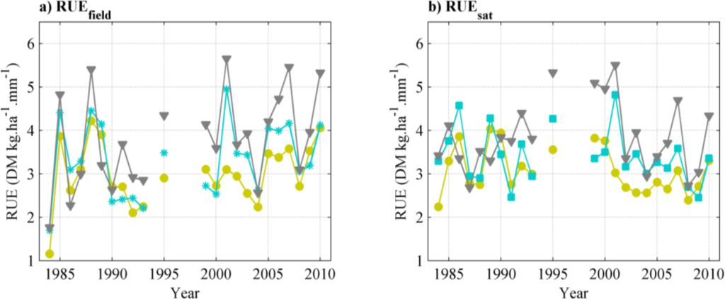 Two time-series of Rain Use Efficiency are calculated as the ratio of spatially averaged ANPPfield and ANPPsat, respectively, to annual rainfall, over the Gourma window. These time-series are referred to as “RUEfield” and “RUEsat”.
