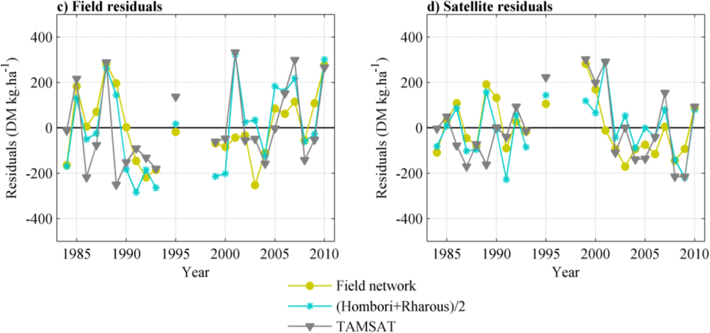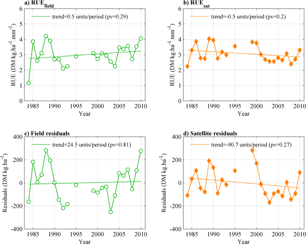 The relationship between field-derived ANPP and rainfall is illustrated by the temporal evolution of RUE and ANPP residuals over 1984–2010 (Figure 5a,c): RUEfield displays a low value in 1984, followed by a series of relatively high but variable RUE (or positive residuals) in 1985–1989, and then a rapid decrease from 1988 to 1992 followed by a slow recovery until 2010. Over the whole period, neither RUEfield nor field ANPP residuals show significant trends (p values of 0.29 and 0.81, respectively). The trend in RUEfield (non-significant) is in fact due to one single very low value observed in 1984. Noticeably, an analysis of RUEfield short-term trends starting after 1992 may suggest an increase in RUE. This again illustrates that trends have to be established over long periods of time and have to be robust over several time periods [17,33].