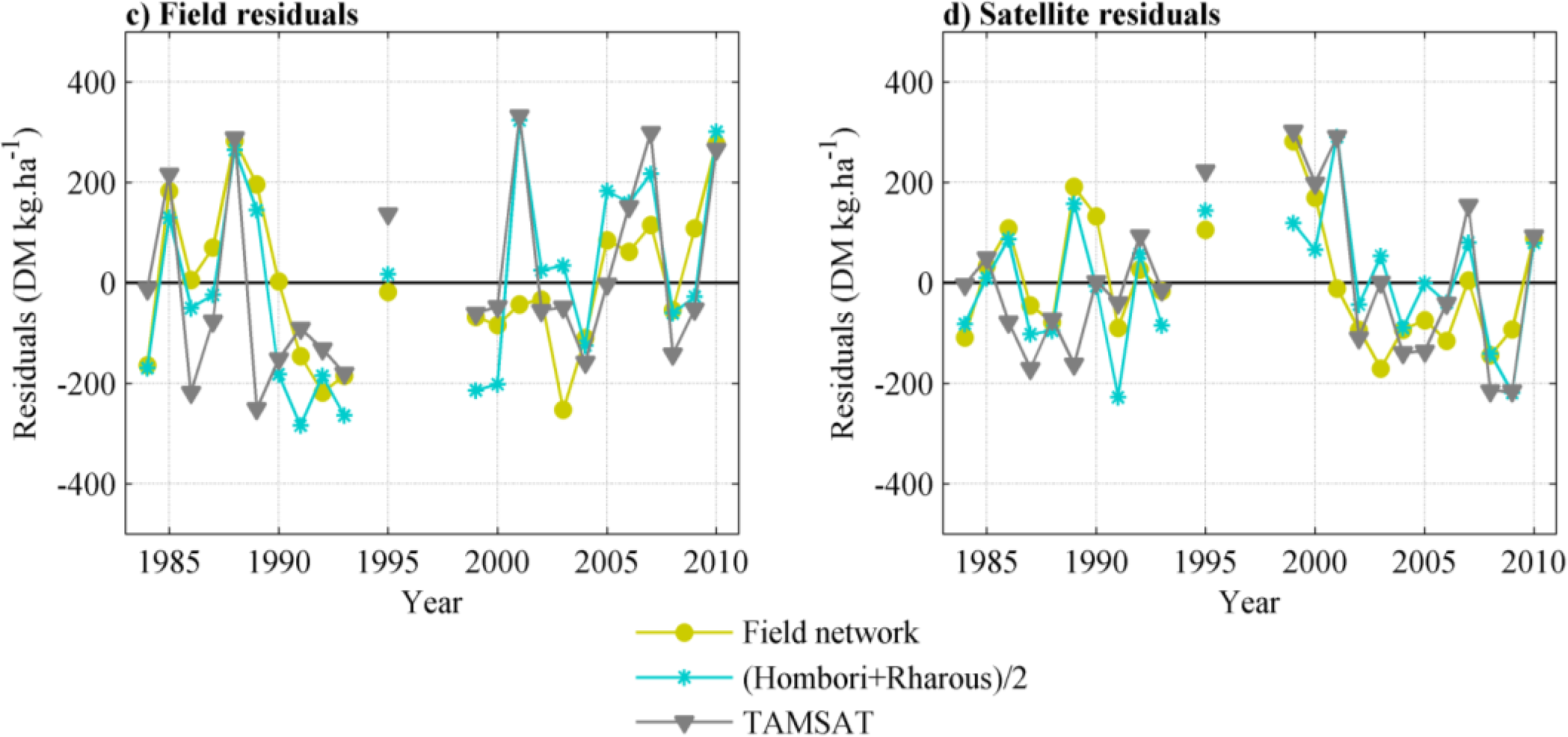 The ANPP residuals method is also applied to both field observations and satellite estimates. First, a linear regression between ANPP estimates (field or satellite) and annual rainfall is calculated, providing the “predicted ANPP” (field or satellite) time series. ANPP residuals are then calculated as the difference between observed ANPP and predicted ANPP, and are referred to as “field residuals” and “satellite residuals” for field observations and satellite data, respectively.