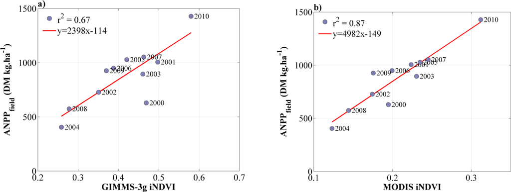 Linear regression performed over 2000–2010 between ANPPfield and iNDVI derived from (a) GIMMS-3g data and (b) MODIS MOD13C2 data.