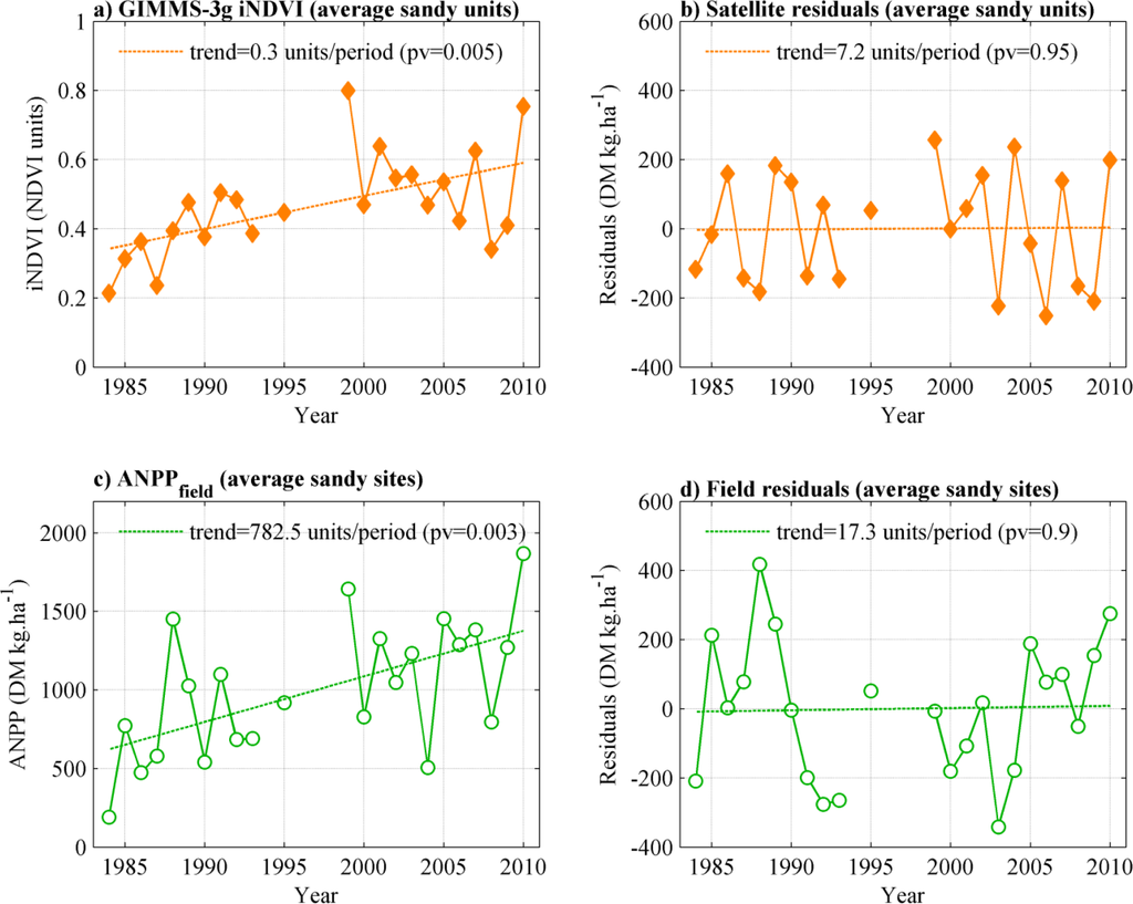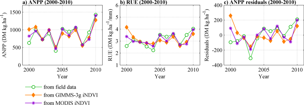 In addition, the derivation of long series of NDVI needs to solve a number of problems like orbital drift, changing atmospheric conditions, sensor degradation [41]. As a result, the accuracy of long-term estimates of ANPP derived from NDVI is not well-known, especially for biomes where long-term ground data are scarce. Given these uncertainties, it is certainly important to evaluate long-term time series of RUE and ANPP residuals with corresponding long-term ground data [17,33,36].
