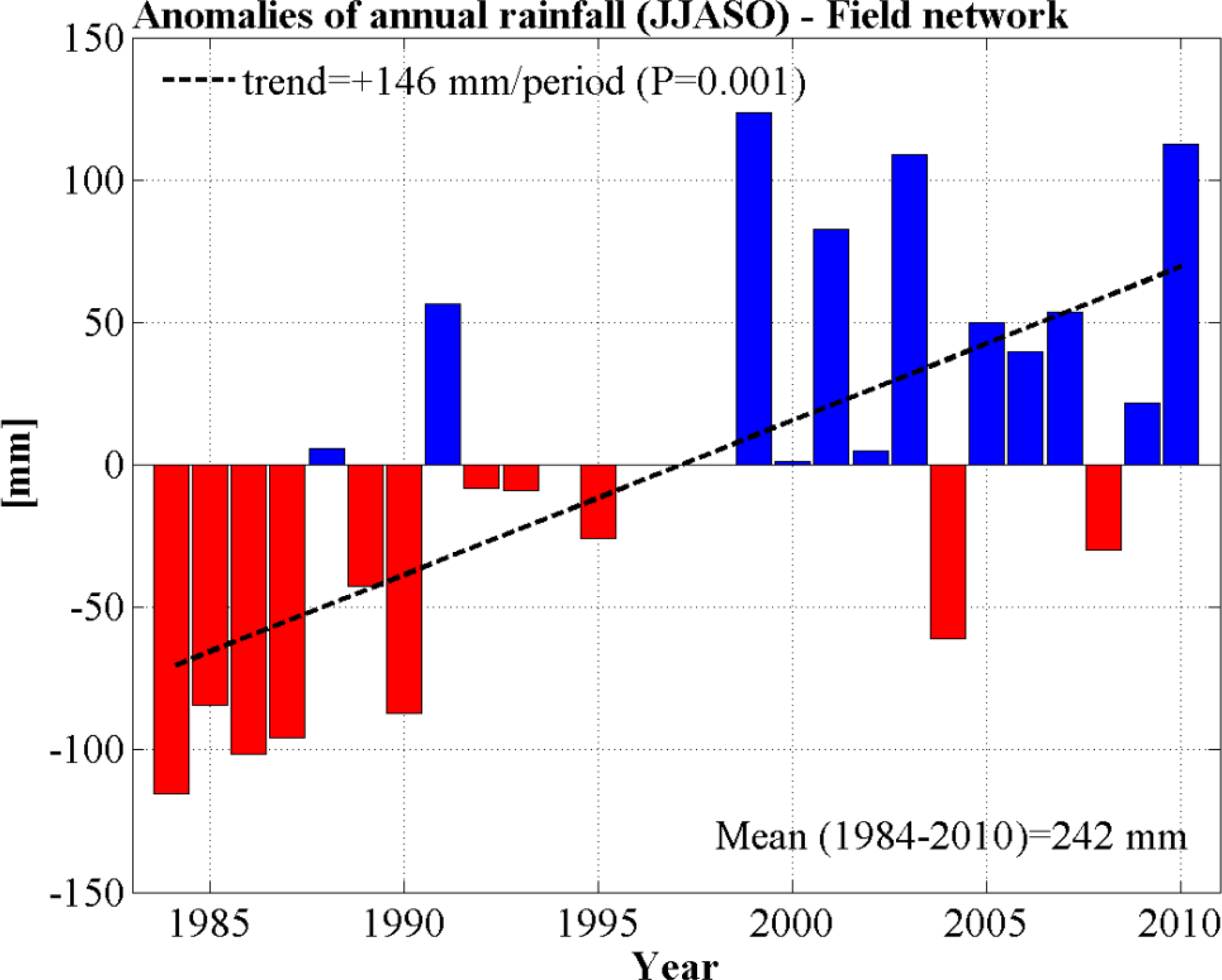 JJASO rainfall anomalies over 1984–2010 derived from averaging daily records from gauges installed near each vegetation site of the Gourma region. Anomalies are calculated from the 1984–2010 mean. They clearly show the recovery of the precipitation after the extreme drought of 1984.