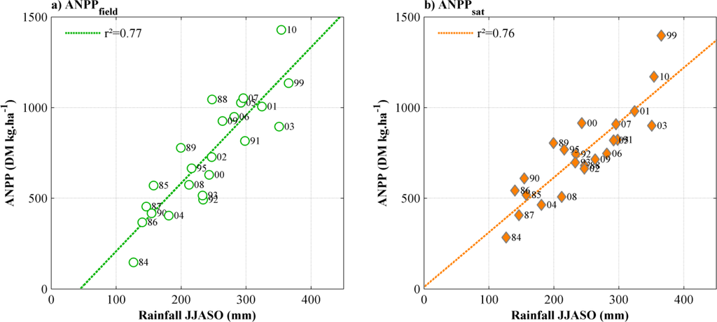 (a) Regression of field ANPP against JJASO rainfall. (b) Same for satellite-derived ANPP. The year is indicated next to each point (two-digits).