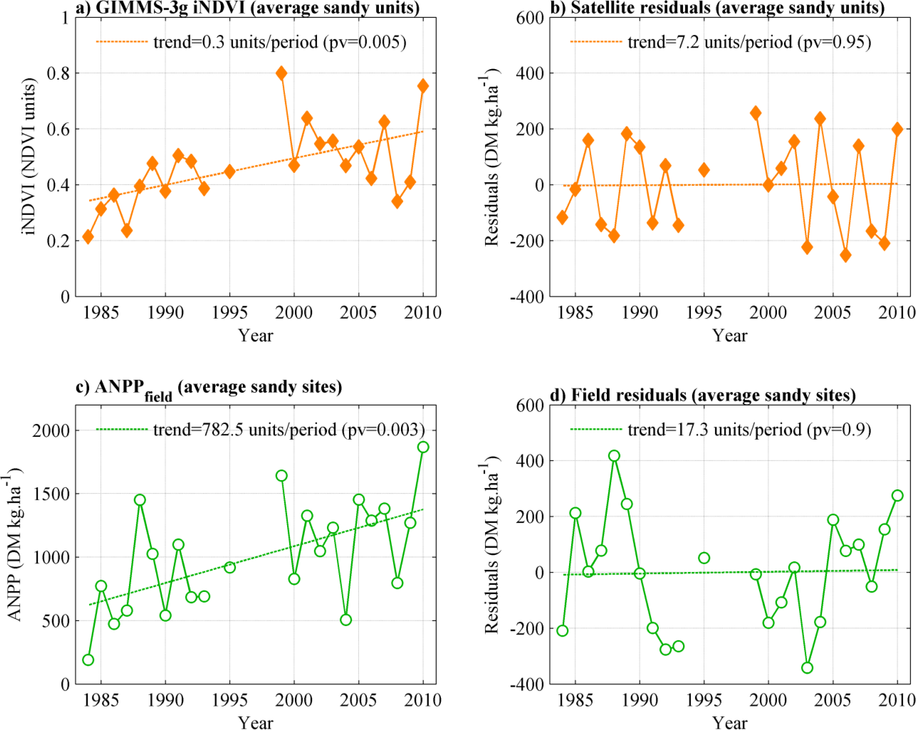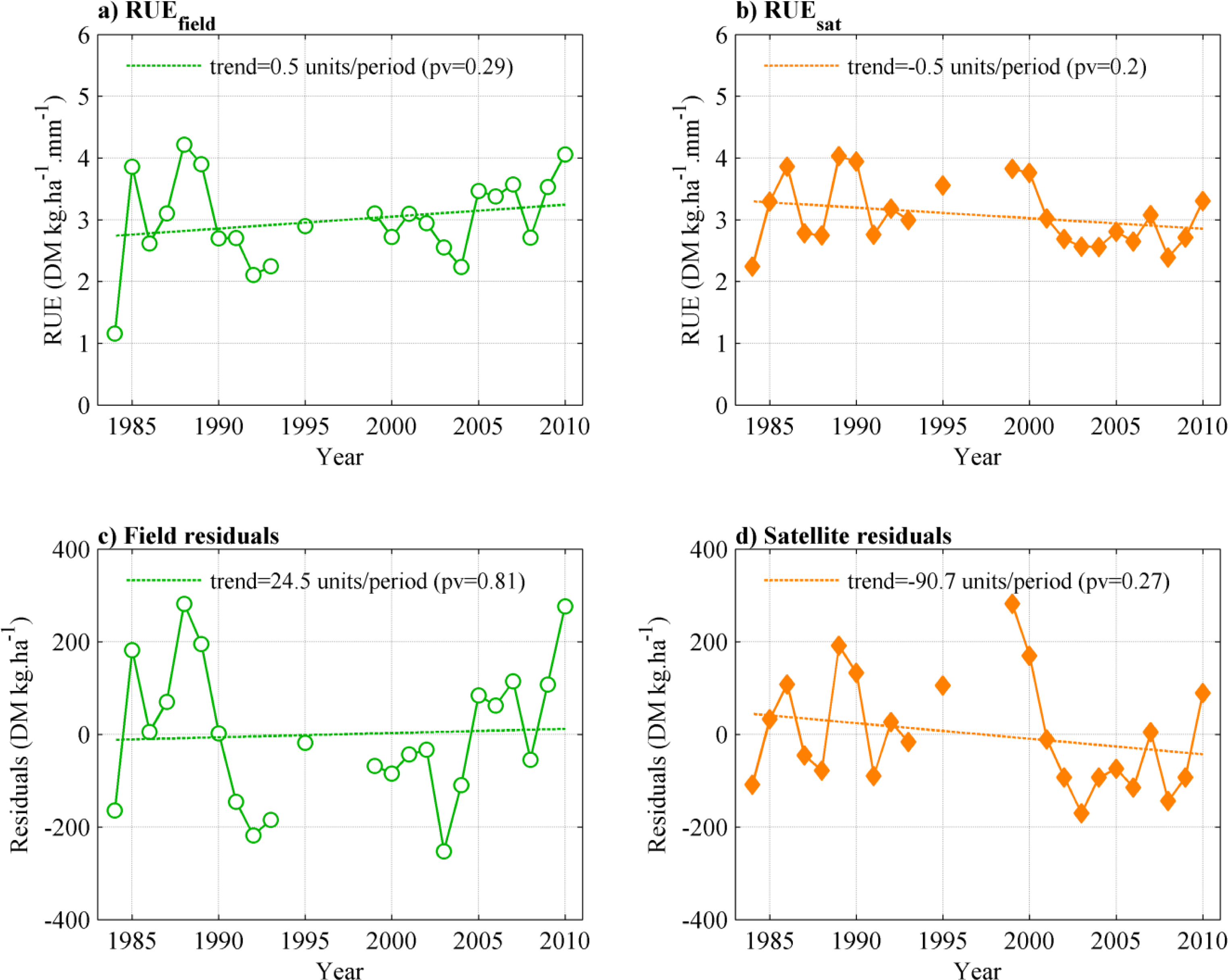 Time-series of RUE calculated with (a) field ANPP and (b) satellite estimates of ANPP. Time-series of ANPP residuals derived from (c) field ANPP and (d) satellite ANPP. Trends are not significant at the 95% level.