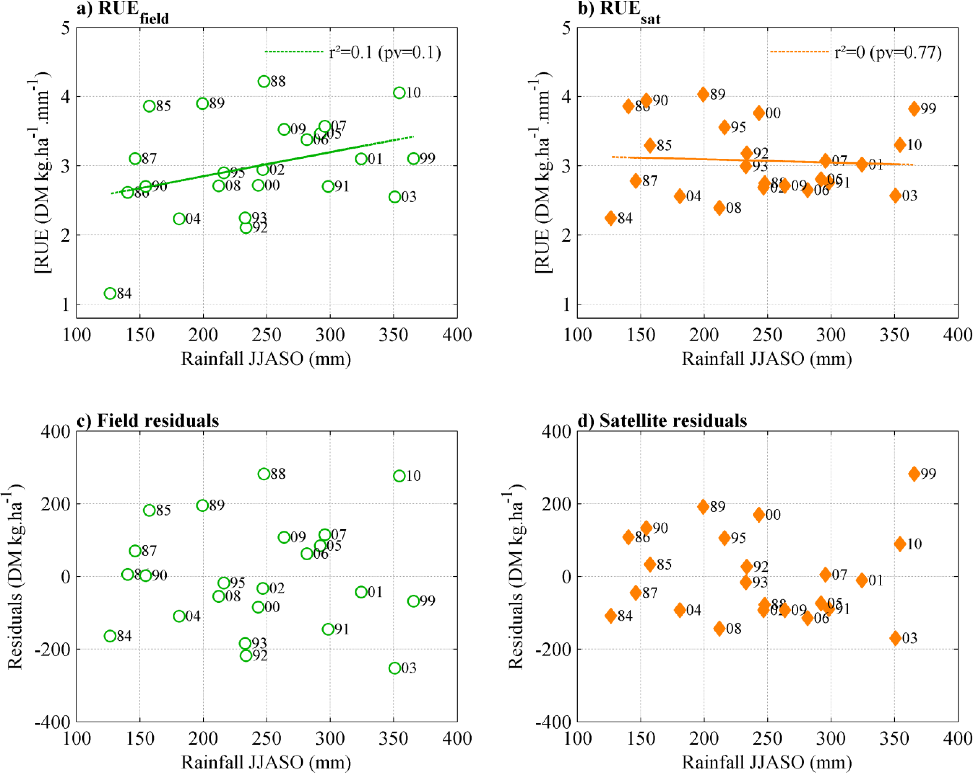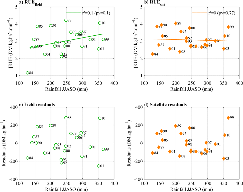 For the Gourma region, RUEfield is slightly and positively correlated to rainfall (r2 = 0.1; Figure 6a). The correlation is significant at the 90% level (p = 0.10) but is caused by year 1984 only. On the other hand, the field residuals do not display any particular pattern when plotted against rainfall (Figure 6c), showing no support for non-linearity of the ANPP/rainfall relationship over the range of rainfall considered here. The highest rainfall values result in proportionally high ANPP, with no evidence of other factors (like nutrient status, being increasingly limiting when the water constraint is relieved). When looking at the results obtained with satellite-derived ANPP, RUEsat is not correlated to rainfall and the satellite residuals do not suggest either any non-linear relationship between ANPP and rainfall (Figure 6b,d).